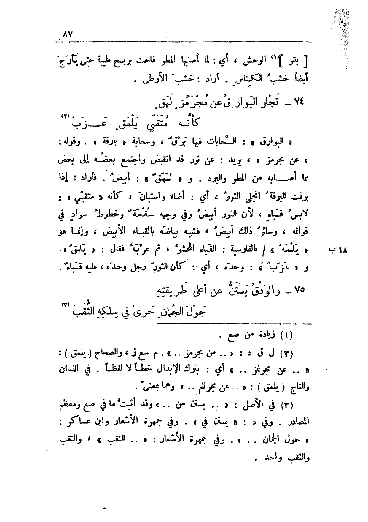 "البوارق": السحابات فيها برق، وسحابة "بارقة". وقوله: "عن مجرمز"، يريد: عن ثور قد انقبض واجتمع بعضه إلى بعض مما أصابه من المطر والبرد. و"لهقٌ": أبيضُ. فأراد: إذا برقت البرقة انجلى الثور، أي: أضاء واستبان، كأنه "متقبي": لابسُ قباءٍ، لأن الثور أبيضُ وفي وجهه سفعةٌ وخطوطُ سوادٍ في قوائمه، وسائرُ ذلك أبيضُ، فشبه بياضه بالقباء الأبيض، وإنما هو "يلمه" 19 ب/ بالفارسية: القباء المحشو، ثم عرَّبه فقال: "يلمق". و"عزبٌ": وحده، أي: كأن الثور رجل وحده، عليه قباءٌ.