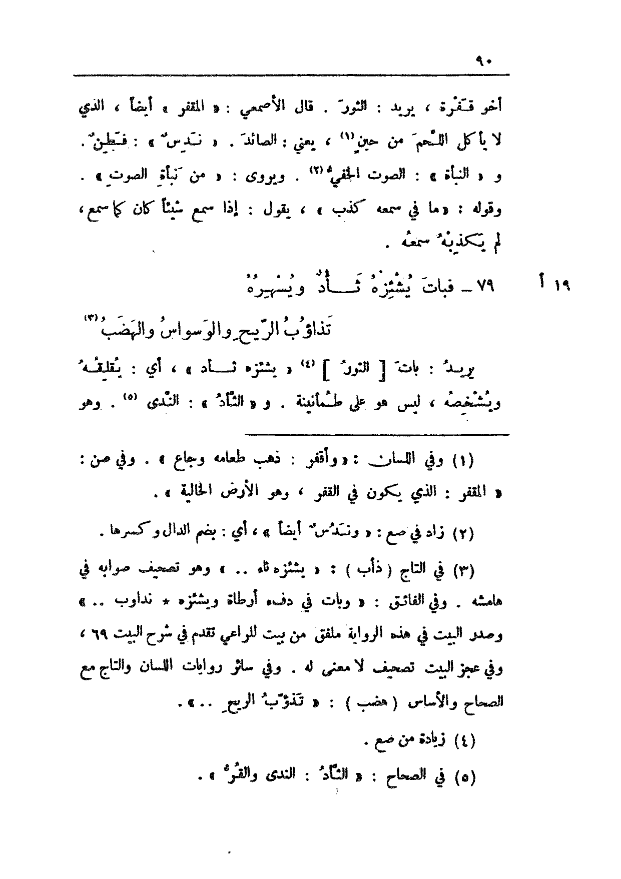 أخو قفرة، يريد: الثور. قال الأصمعي: "المقفر" أيضاً، الذي لا يأكل اللحم من حينٍ، يعني: الصائد. "ندس": فبطن. و"النبأة": الصوت الخفي. ويروى: "من نبأة الصوت". وقوله: "ما في سمعه كذب"، يقول: إذا سمع شيئاً كان كما سمع، لم يكذبه سمعه.