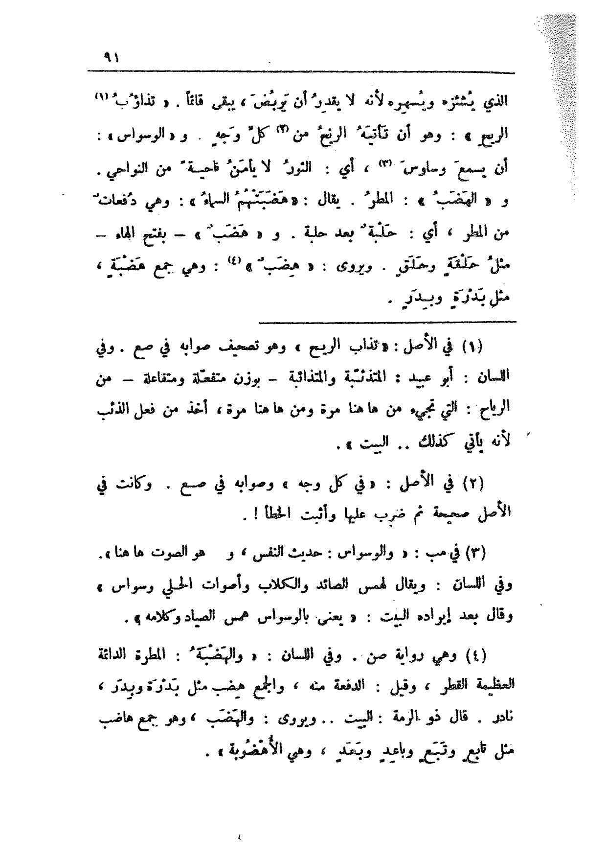 الذي يُشئزه ويسهره لأنه لا يقدر أن يربض، يبقى قائماً. "تذاؤب الريح": وهو أن تأتيه الريح من كل وجهٍ. و"الوسواس": أن يسمع وساوس، أي: الثور لا يأمن ناحيةً من النواحي. و"الهضب": المطر. يقال: "هضبتهم السماء": وهي دُفعات من المطر، أي: حلبة بعد حلبة. و"هضبٌ" - بفتحالهاء- مثلُ حلقةٍ وحلقٍ. ويروى: "هضبٌ": وهي جمع هضبةٍ، مثل بدرةٍ وبدرٍ.
