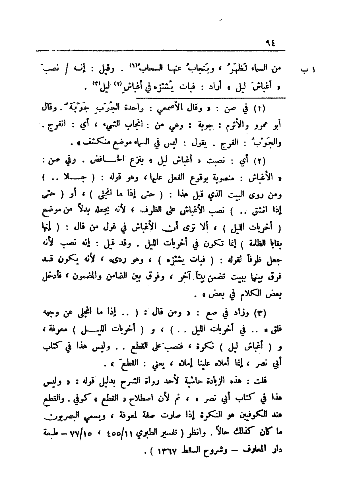 من السماء تظهر، وينجاب عنها السحاب. وقيل: إنه 1 ب/ نصب "أغباش ليل" أراد: فبات يشئزه في أغباش ليل.