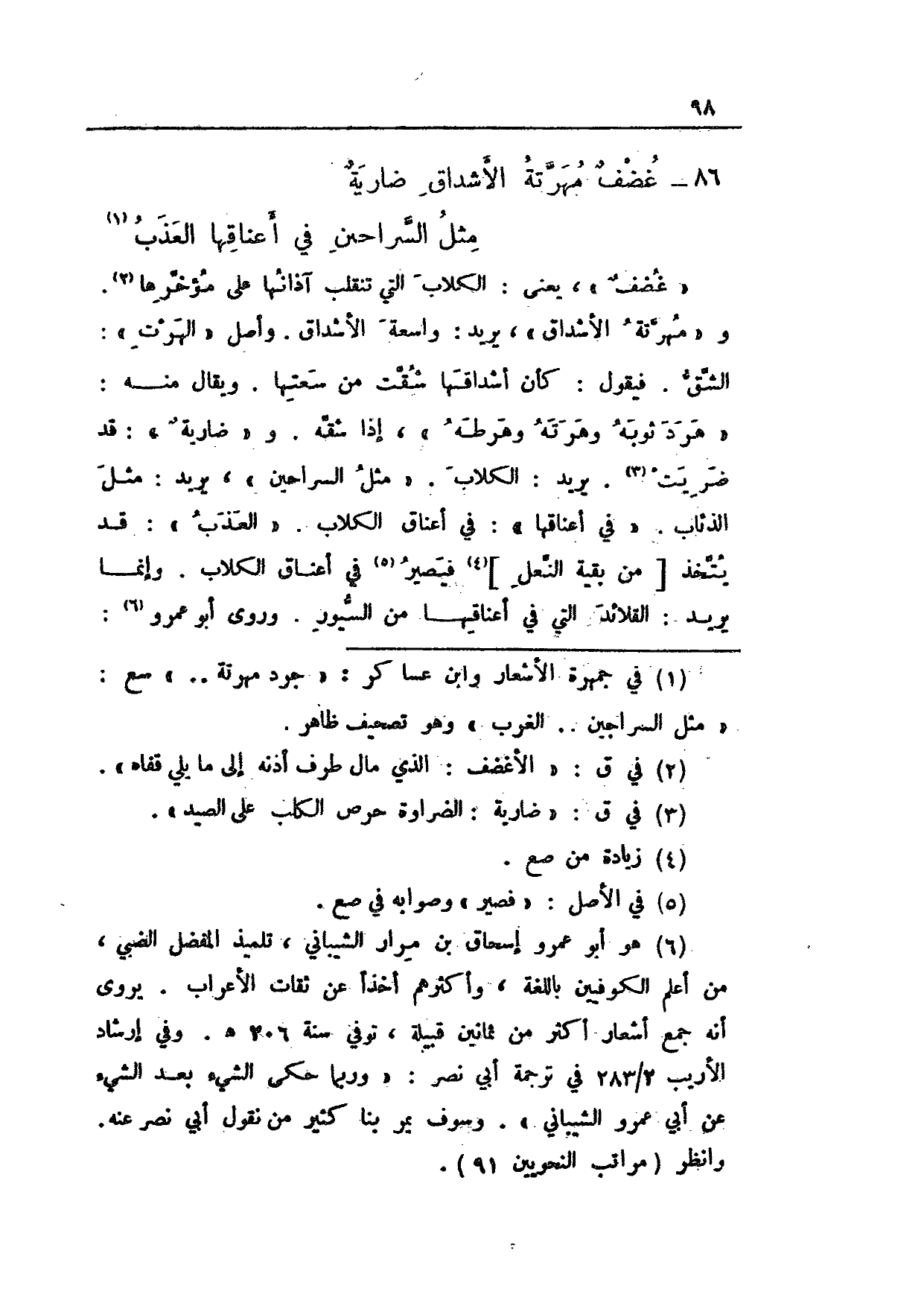 86 - غضف مهرتة الأشداق ضاريةٌ ... مثل السراحين في أعناقها العذب