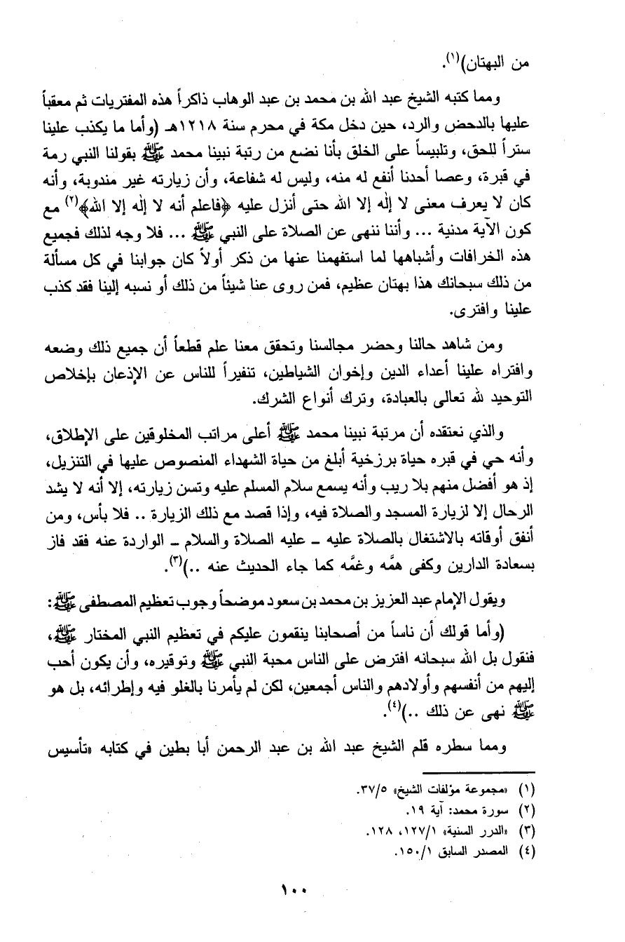 ومما كتبه الشيخ عبد الله بن محمد بن عبد الوهاب ذاكرا هذه المفتريات ثم معقبا عليها بالدحض والرد، حين دخل مكة في محرم سنة 1218هـ (وأما ما يكذب علينا سترا للحق، وتلبيسا على الخلق بأنا نضع من رتبة نبينا محمد صلى الله عليه وسلم بقولنا النبي رمة في قبرة، وعصا أحدنا أنفع له منه، وليس له شفاعة، وأن زيارته غير مندوبة، وأنه كان لا يعرف معنى لا إله إلا الله حتى أنزل عليه {فَاعْلَمْ أَنَّهُ لا إِلَهَ إِلَّا اللَّهُ} 2 مع كون الآية مدنية ... وأننا ننهى عن الصلاة على النبي صلى الله عليه وسلم ... فلا وجه لذلك فجميع هذه الخرافات وأشباهها لما استفهمنا عنها من ذكر أولا كان جوابنا في كل مسألة من ذلك سبحانك هذا بهتان عظيم، فمن روى عنا شيئا من ذلك أو نسبه إلينا فقد كذب علينا وافترى.