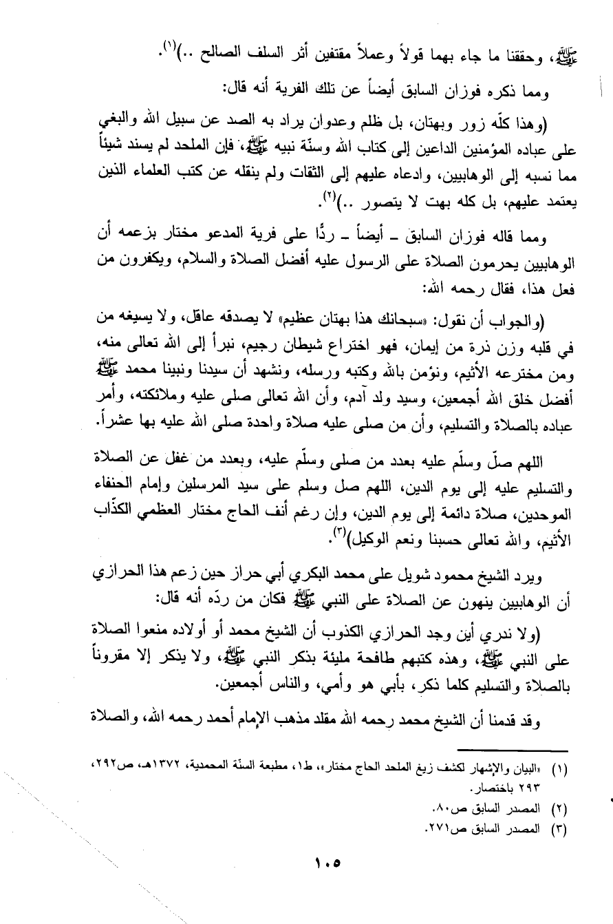 (وهذا كله زور وبهتان، بل ظلم وعدوان يراد به الصد عن سبيل الله والبغي على عباده المؤمنين الداعين إلى كتاب الله وسنة نبيه صلى الله عليه وسلم فإن الملحد لم يسند شيئاً مما نسبه إلى الوهابيين، وادعاه عليهم إلى الثقات ولم ينقله عن كتب العلماء الذين يعتمد عليهم، بل كله بهت لا يتصور..) 2.
