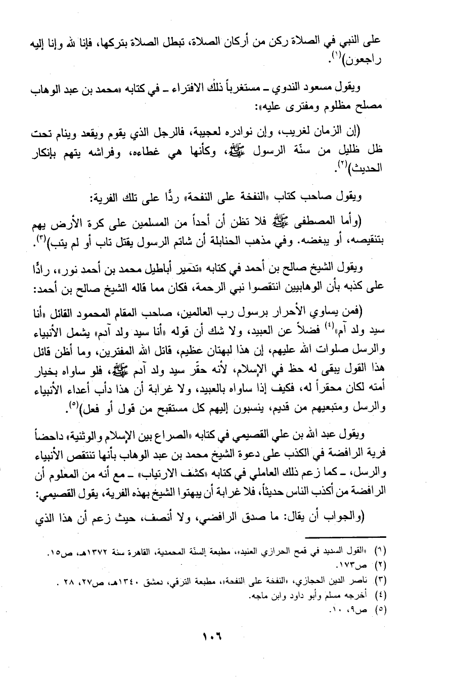 (فمن يساوي الأحرار برسول رب العالمين، صاحب المقام المحمود القائل "أنا سيد ولد آدم" 4 فضلا عن العبيد، ولا شك أن قوله "أنا سيد ولد آدم" يشمل الأنبياء والرسل صلوات الله عليهم، إن هذا لبهتان عظيم، قاتل الله المفترين، وما أظن قائل هذا القول يبقى له حظ في الإسلام، لأنه حقر سيد ولد آدم صلى الله عليه وسلم فلو ساواه بخيار أمته لكان محقراً له، فكيف إذا ساواه بالعبيد، ولا غرابة أن هذا دأب أعداء الأنبياء والرسل ومتبعيهم من قديم، ينسبون إليهم كل مستقبح من قول أو فعل) 5.