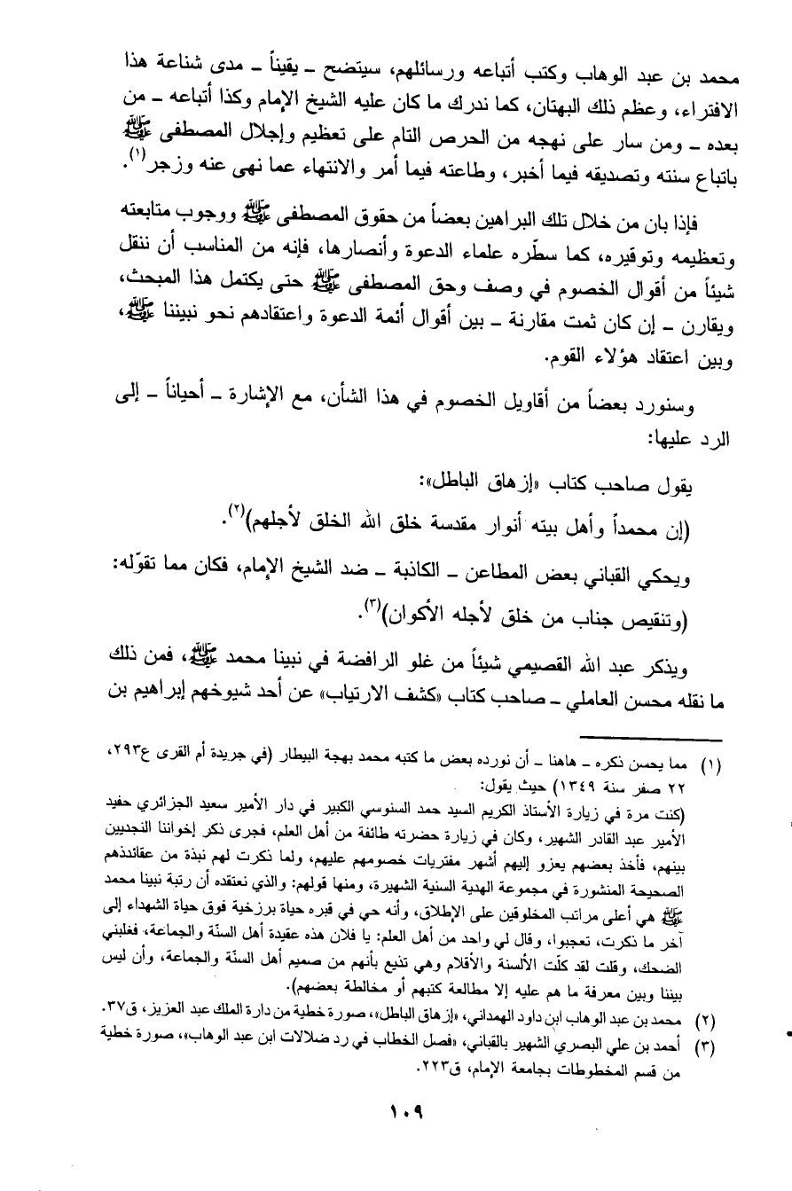 محمد بن عبد الوهاب وكتب أتباعه ورسائلهم، سيتضح- يقينا- مدى شناعة هذا الافتراء، وعظم ذلك البهتان، كما ندرك ما كان عليه الشيخ الإمام وكذا أتباعه- من بعده- ومن سار على نهجه من الحرص التام على تعظيم وإجلال المصطفى صلى الله عليه وسلم باتباع سنته وتصديقه فيما أخبر، وطاعته فيما أمر والانتهاء عما نهى عنه وزجر1.