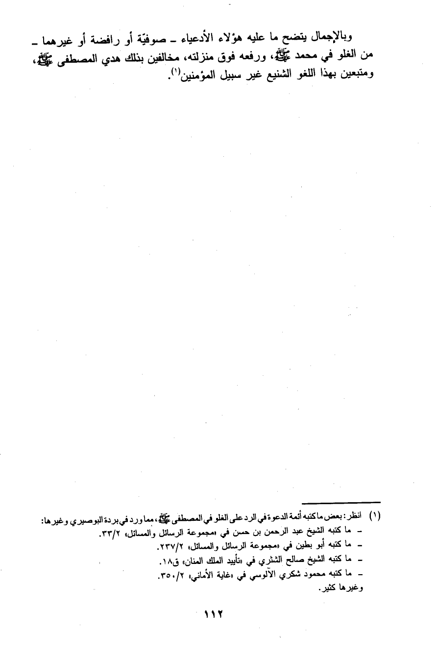 1 انظر: بعض ما كتبه أئمة الدعوة في الرد على الغلو في المصطفى صلى الله عليه وسلم، مما ورد في بردة البوصيري وغيرها: - ما كتبه الشيخ عبد الرحمن بن حسن في "مجموعة الرسائل والمسائل" 2/33. - ما كتبه أبو بطين في "مجموعة الرسائل والمسائل" 2/237. - ما كتبه الشيخ صالح الشثري في "تأييد الملك المنان" ق18. - ما كتبه محمود شكري الآلوسي في غاية الأماني" 2/350. وغيرها كثير.