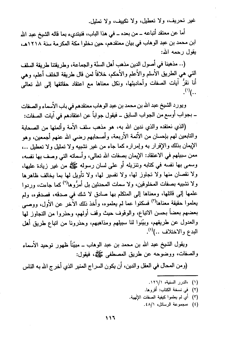 ويقول الشيخ عبد الله بن محمد بن عبد الوهاب- مبيناً ظهور توحيد الأسماء والصفات، ووضوحه عن طريق المصطفى صلى الله عليه وسلم فيقول: