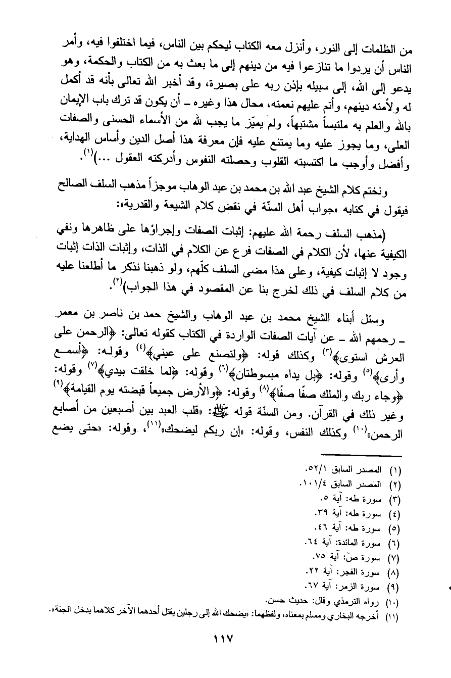 وسئل أبناء الشيخ محمد بن عبد الوهاب والشيخ حمد بن ناصر بن معمر- رحمهم الله- عن آيات الصفات الواردة في الكتاب كقوله تعالى: {الرَّحْمَنُ عَلَى الْعَرْشِ اسْتَوَى} 3 وكذلك قوله: {وَلِتُصْنَعَ عَلَى عَيْنِي} 4 وقوله: {أَسْمَعُ وَأَرَى} 5 وقوله: {بَلْ يَدَاهُ مَبْسُوطَتَانِ} 6 وقوله: {لِمَا خَلَقْتُ بِيَدَيّ} 7 وقوله: {وَجَاءَ رَبُّكَ وَالْمَلَكُ صَفّاً صَفّاً} 8 وقوله: {وَالأَرْضُ جَمِيعاً قَبْضَتُهُ يَوْمَ الْقِيَامَةِ} 9 وغير ذلك في القرآن. ومن السنة قوله صلى الله عليه وسلم " قلب العبد بين إصبعين من أصابع الرحمن " 10 11 وكذلك النفس، وقوله: " إن ربكم ليضحك " 12 وقوله: " حتى يضع