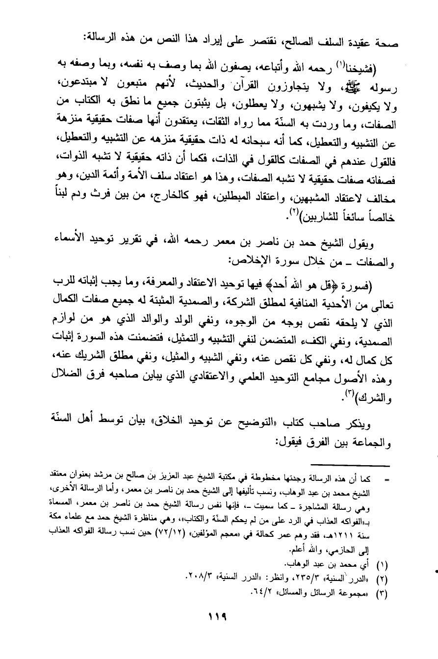 (فشيخنا1 رحمه الله وأتباعه، يصفون الله بما وصف به نفسه، وبما وصفه به رسوله صلى الله عليه وسلم ولا يتجاوزون القرآن والحديث، لأنهم متبعون لا مبتدعون، ولا يكيفون، ولا يشبهون، ولا يعطلون، بل يثبتون جميع ما نطق به الكتاب من الصفات، وما وردت به السنة مما رواه الثقات، يعتقدون أنها صفات حقيقية منزهة عن التشبيه والتعطيل، كما أنه سبحانه له ذات حقيقية منزهه عن التشبيه والتعطيل، فالقول عندهم في الصفات كالقول في الذات، فكما أن ذاته حقيقية لا تشبه الذوات، فصفاته صفات حقيقية لا تشبه الصفات، وهذا هو اعتقاد سلف الأمة وأئمة الدين، وهو مخالف لاعتقاد المشبهين، واعتقاد المبطلين، فهو كالخارج من بين فرث ودم لبناً خالصاً سائغا للشاربين) 2.