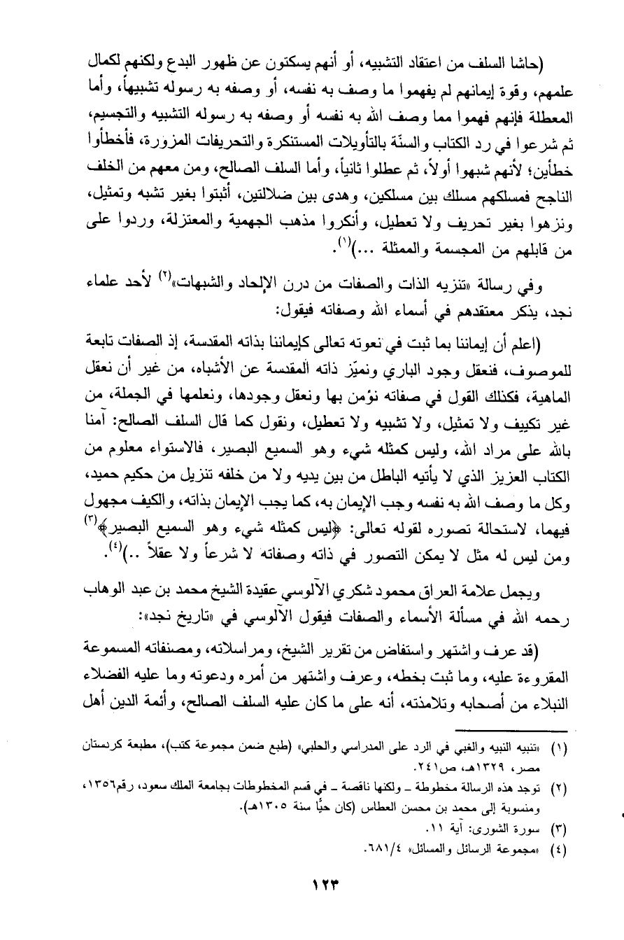 ويجمل علامة العراق محمود شكري الآلوسي عقيدة الشيخ محمد بن عبد الوهاب رحمه الله في مسألة الأسماء والصفات فيقول الآلوسي في "تاريخ نجد":