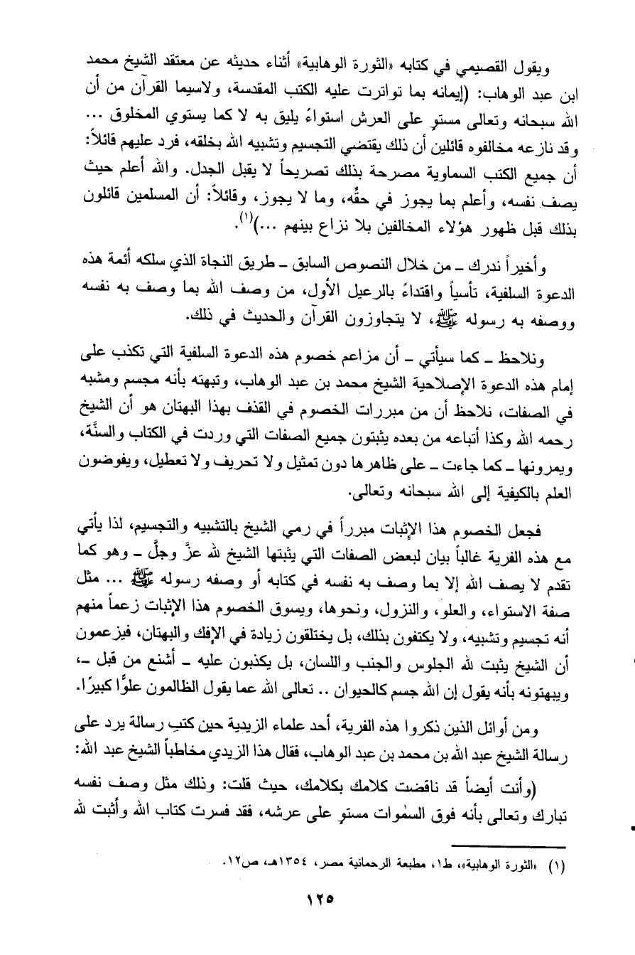 ويقول القصيمي في كتابه "الثورة الوهابية" أثناء حديثه عن معتقد الشيخ محمد ابن عبد الوهاب: (إيمانه بما تواترت عليه الكتب المقدسة، ولا سيما القرآن من أن الله سبحانه وتعالى مستو على العرش استواء يليق به لا كما يستوي المخلوق ... وقد نازعه مخالفوه قائلين إن ذلك يقتضي التجسيم وتشبيه الله بخلقه، فرد عليهم قائلا: إن جميع الكتب السماوية مصرحة بذلك تصريحاً لا يقبل الجدل. والله أعلم حيث يصف نفسه، وأعلم بما يجوز في حقه، وما لا يجوز، وقائلا: إن المسلمين قائلون بذلك قبل ظهور هؤلاء المخالفين بلا نزاع بينهم ... ) 1.
