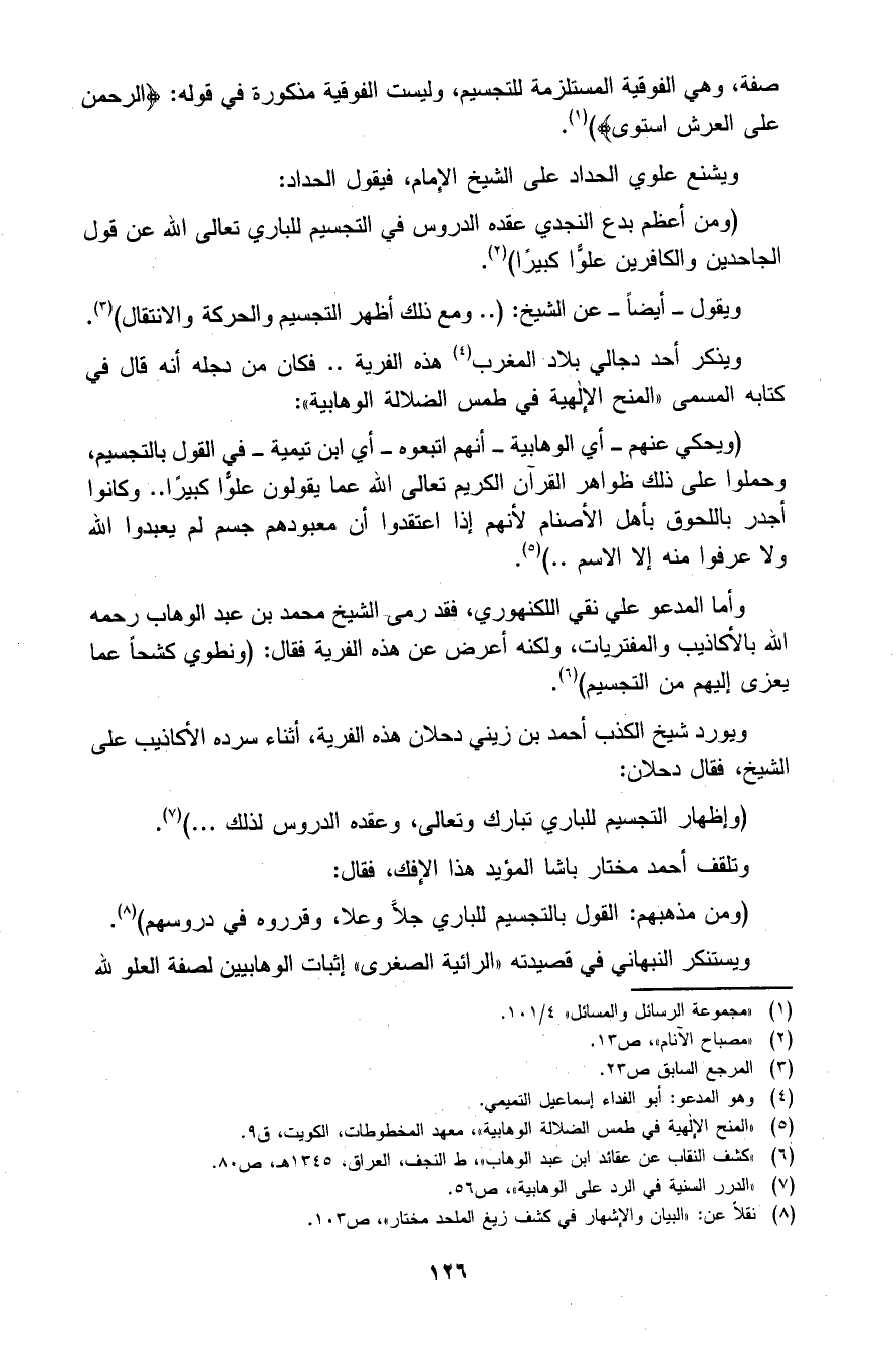 (ومن أعظم بدع النجدي عقده الدروس في التجسيم للباري تعالى الله عن قول الجاحدين والكافرين علواً كبيرا) 3. ويقول -أيضا- عن الشيخ: (.. ومع ذلك أظهر التجسيم والحركة والانتقال) 4.