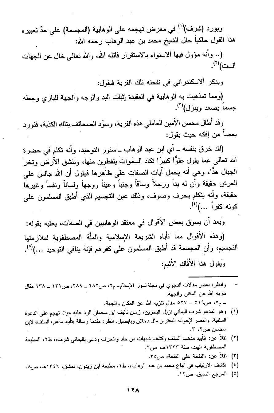(لقد خرق بنفسه- أي ابن عبد الوهاب- ستور التوحيد، وأنه تكلم في حضرة الله تعالى عما يقول علواً كبيراً تكاد السماوات يتفطرن منها، وتنشق الأرض وتخر الجبال هداً، وهي أنه يحمل آيات الصفات على ظاهرها فيقول إن الله جالس على العرش حقيقة وأن له يداً ورجلا وساقا وجنبا وعينا ووجها ولسانا ونفسا وغيرها حقيقة، وأنه يتكلم بحرف وصوف، وذلك عين التجسيم الذي أطبق المسلمون على كونه كفرا ... ) 4. وبعد أن يسوق بعض الأقوال في معتقد الوهابيين في الصفات، يعقبه بقوله: