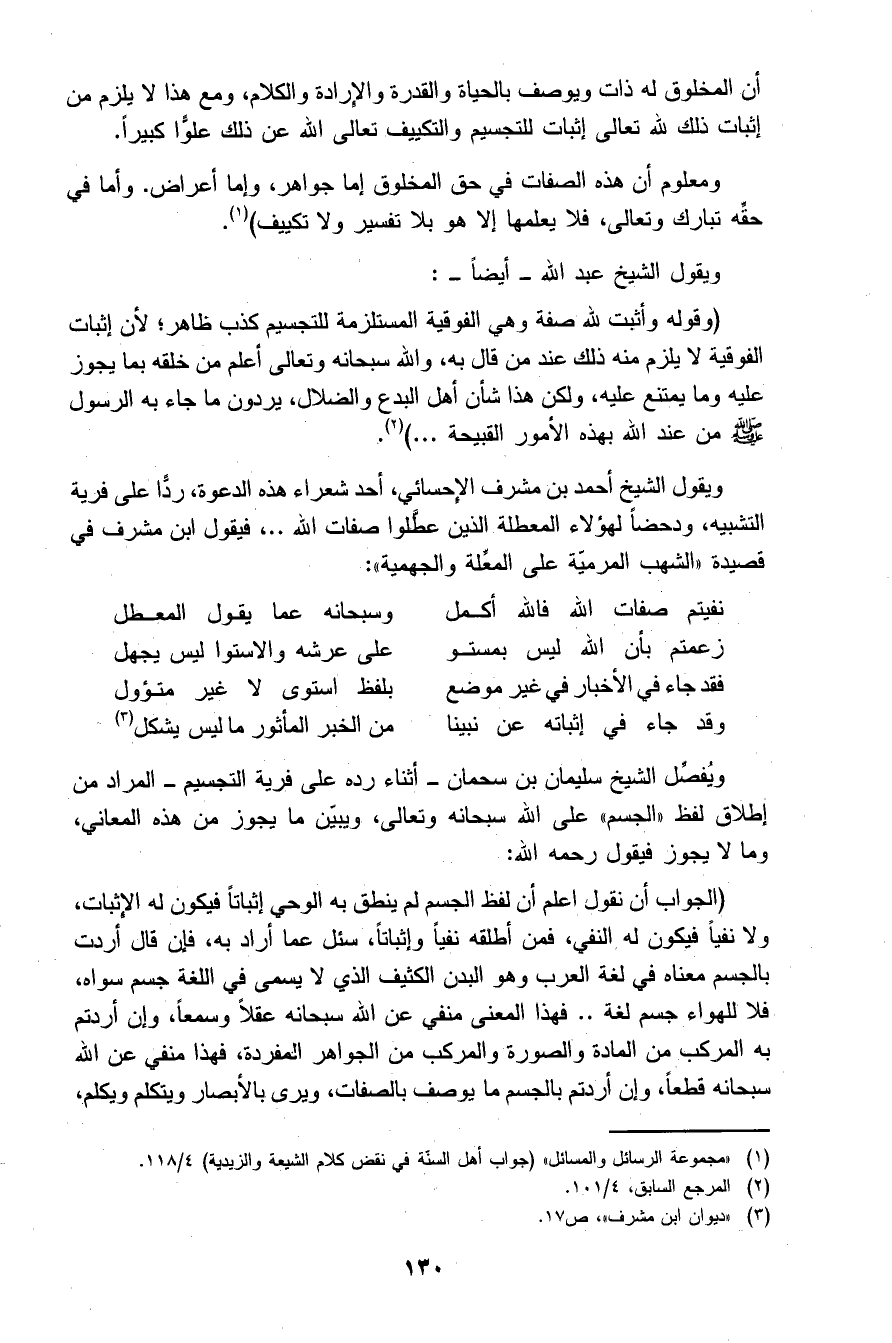 ويفصل الشيخ سليمان بن سحمان- أثناء رده على فرية التجسيم- المراد من إطلاق لفظ "الجسم" على الله سبحانه وتعالى، ويبين ما يجوز من هذه المعاني، وما لا يجوز فيقول رحمه الله: