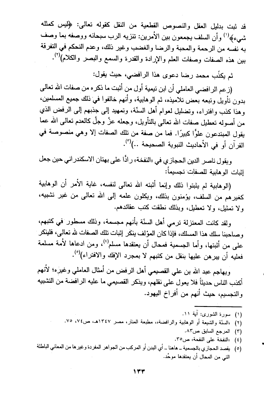 (زعم الرافضي العاملي أن ابن تيمية أول من أثبت ما ذكره من صفات الله تعالى بدون تأويل وتبعه بعض تلاميذه، ثم الوهابية، وأنهم خالفوا في ذلك جميع المسلمين، وهذا كذب وافتراء، وتضليل لعوام أهل السنة، وتمهيد إلى جذبهم إلى الرفض الذي من أصوله تعطيل صفات الله تعالى بالتأويل، وجعله عزوجلكالعدم تعالى الله عما يقول المبتدعون علواً كبيرا. فما من صفة من تلك الصفات إلا وهي منصوصة في القرآن أو في الأحاديث النبوية الصحيحة..) 3.