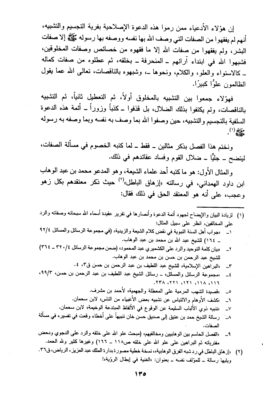 فهؤلاء جمعوا ببن التشبيه بالمخلوق أولا، ثم التعطيل ثانيا، ثم التشبيه بالناقصات، ولم يكتفوا بذلك الضرر، بل قذفوا- كذباً وزوراً- أئمة هذه الدعوة السلفية بالتجسيم والتشبيه، حين وصفوا الله بما وصف به نفسه وبما وصفه به رسوله صلى الله عليه وسلم1.