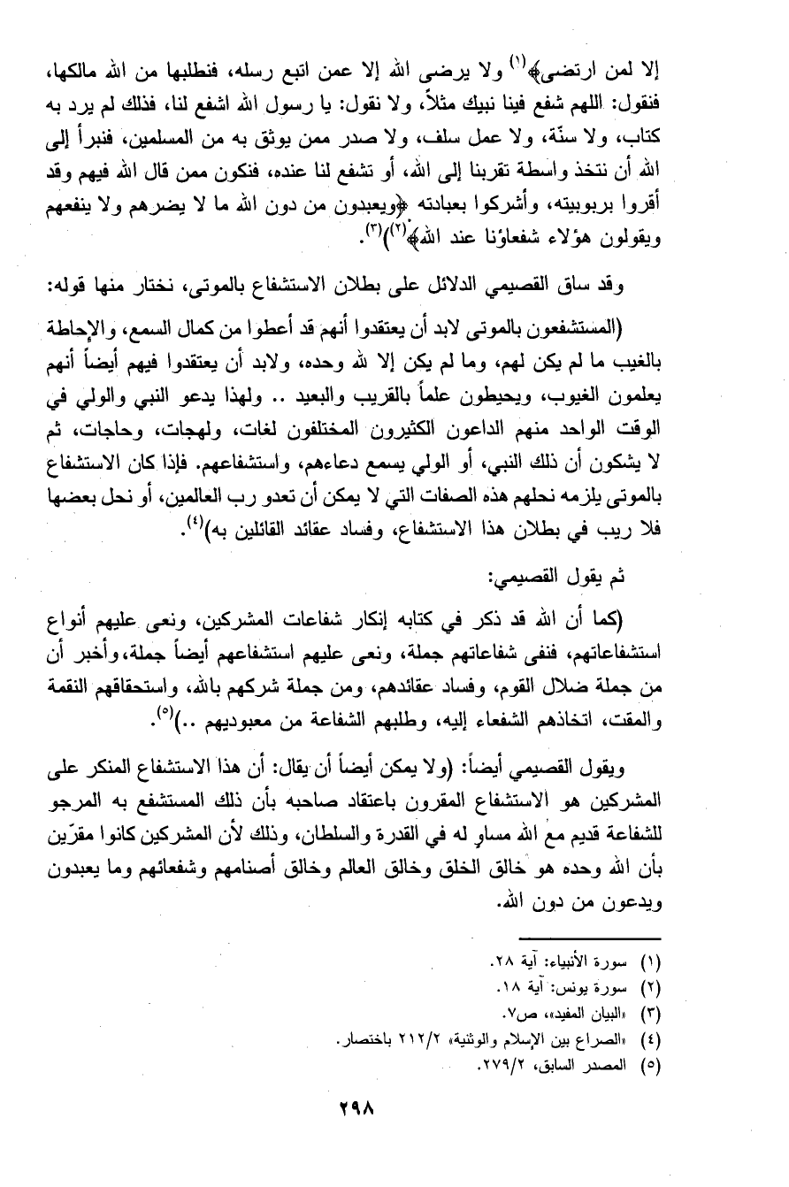 (كما أن الله قد ذكر في كتابه إنكار شفاعات المشركين، ونعى عليهم أنواع استشفاعاتهم، فنفى شفاعاتهم جملة، ونعى عليهم استشفاعهم أيضا جملة، وأخبر أن من جملة ضلال القوم، وفساد عقائدهم، ومن جملة شركهم بالله، واستحقاقهم النقمة والمقت، اتخاذهم الشفعاء إليه، وطلبهم الشفاعة من معبوديهم..) 5.