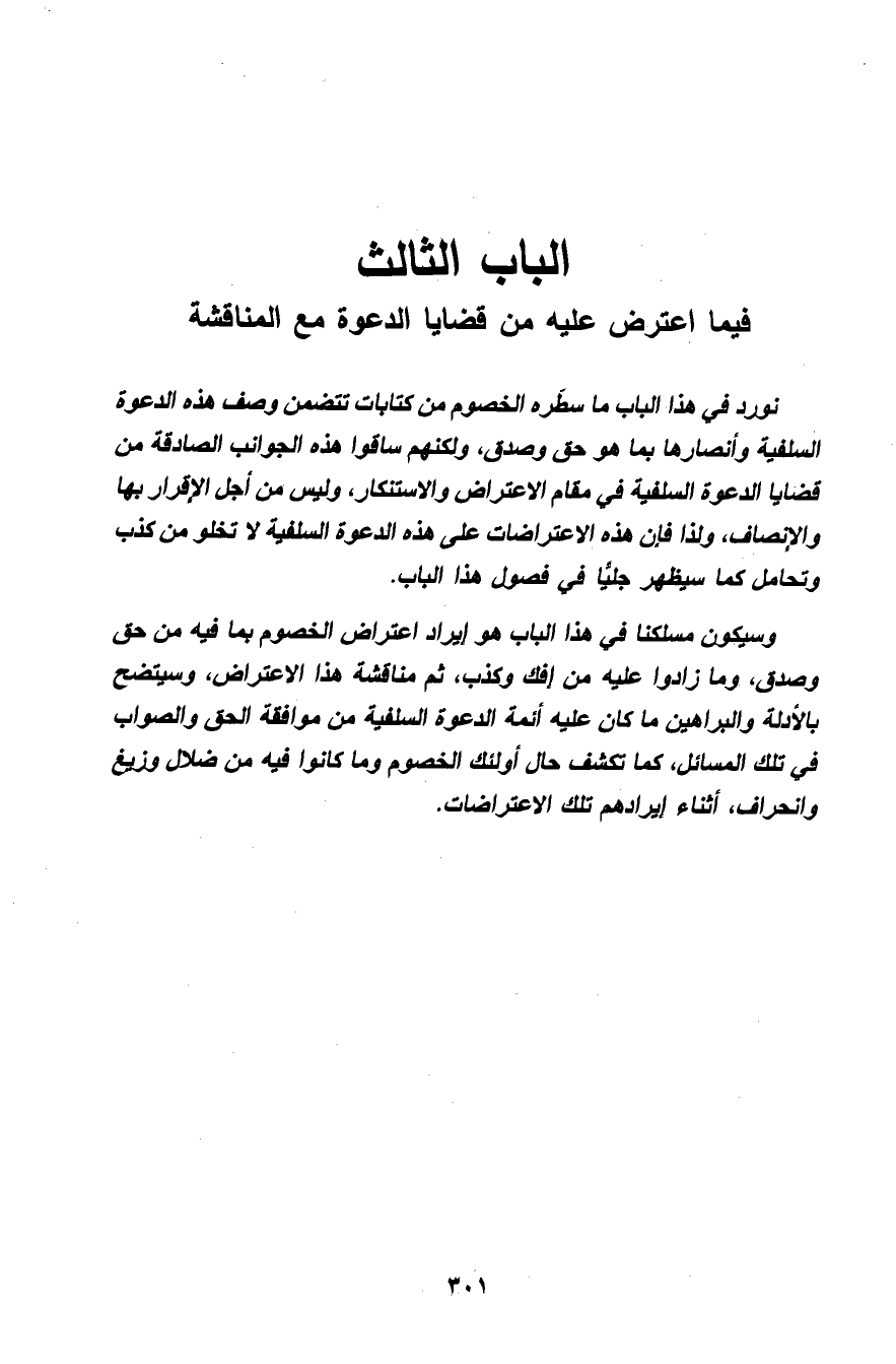 نورد في هذا الباب ما سطره الخصوم من كتابات تتضمن وصف هذه الدعوة السلفية وأنصارها بما هو حق وصدق، ولكنهم ساقوا هذه الجوانب من قضايا الدعوة السلفية في مقام الاعتراض والاستنكار، وليس من أجل الإقرار بها والإنصاف، ولذا فإن هذه الاعتراضات على هذه الدعوة السلفية لا تخلو من كذب وتحامل كما سيظهر جليا في فصول هذا الباب.