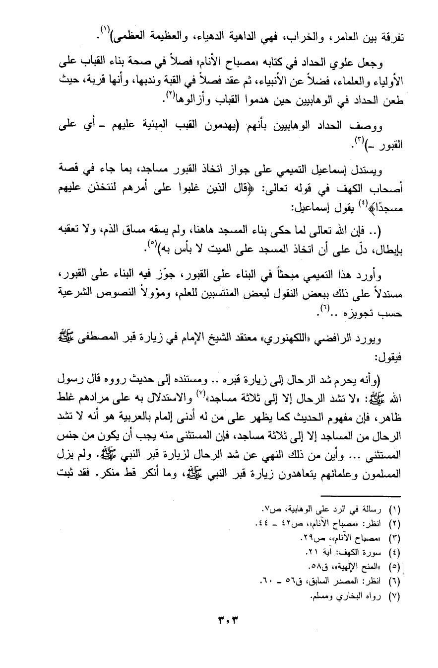 (وأنه يحرم شد الرحال إلى زيارة قبره.. ومستنده إلى حديث رووه قال رسول الله صلى الله عليه وسلم " لا تشد الرحال إلا إلى ثلاثة مساجد " 7 والاستدلال به على مرادهم غلط ظاهر، فإن مفهوم الحديث كما يظهر على من له أدنى إلمام بالعربية هو أنه لا تشد الرحال من المساجد إلا إلى ثلاثة مساجد، فإن المستثنى منه يجب أن يكون من جنس المستثنى ... وأين من ذلك النهي عن شد الرحال لزيارة قبر النبي صلى الله عليه وسلم. ولم يزل المسلمون وعلماؤهم يتعاهدون زيارة قبر النبي صلى الله عليه وسلم وما أنكر قط منكر. فقد ثبت
