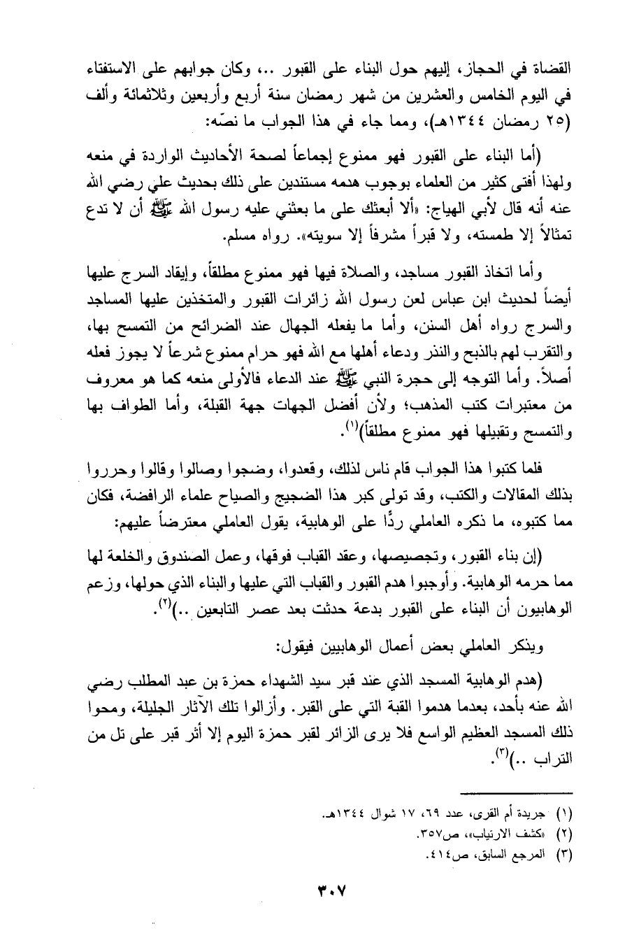 (هدم الوهابية المسجد الذي عند قبر سيد الشهداء حمزة بن عبد المطلب رضي الله عنه بأحد، بعدما هدموا القبة التي على القبر. وأزالوا تلك الآثار الجليلة، ومحوا ذلك المسجد العظيم الواسع فلا يرى الزائر لقبر حمزة اليوم إلا أثر قبر على تل من التراب..) 4.