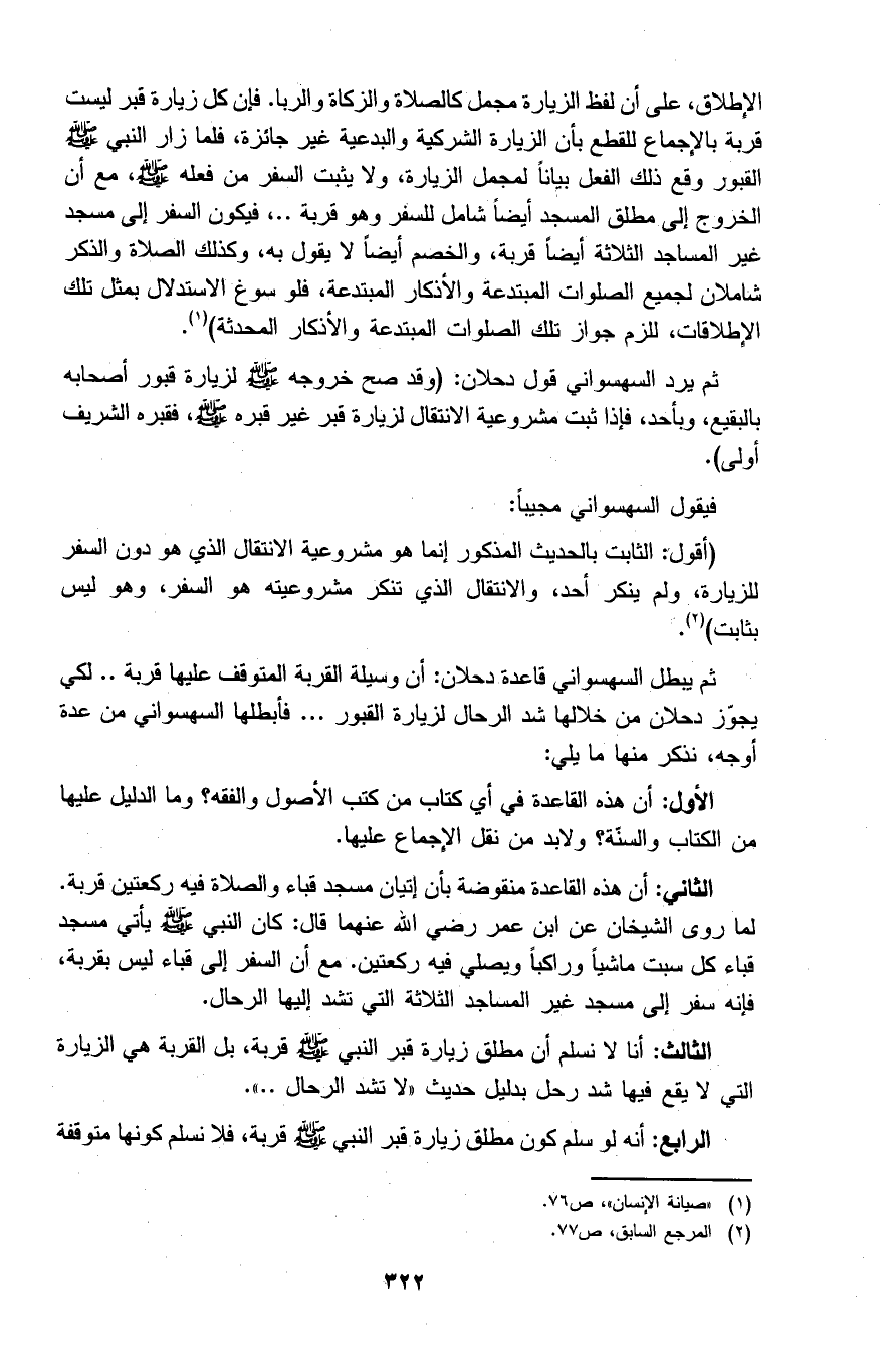 الإطلاق، على أن لفظ الزيارة مجمل كالصلاة والزكاة والربا. فإن كل زيارة قبر ليست قربة بالإجماع للقطع بأن الزيارة الشركية والبدعية غير جائزة، فلما زار النبي صلى الله عليه وسلم القبور وقع ذلك الفعل بيانا لمجمل الزيارة، ولا يثبت السفر من فعله صلى الله عليه وسلم مع أن الخروج إلى مطلق المسجد أيضا شامل للسفر وهو قربة..، فيكون السفر إلى مسجد غير المساجد الثلاثة أيضا قربة، والخصم أيضا لا يقول به، وكذلك الصلاة والذكر شاملان لجميع الصلوات المبتدعة والأذكار المبتدعة، فلو سوغ الاستدلال بمثل تلك الإطلاقات، للزم جواز تلك الصلوات المبتدعة والأذكار المحدثة) 1.