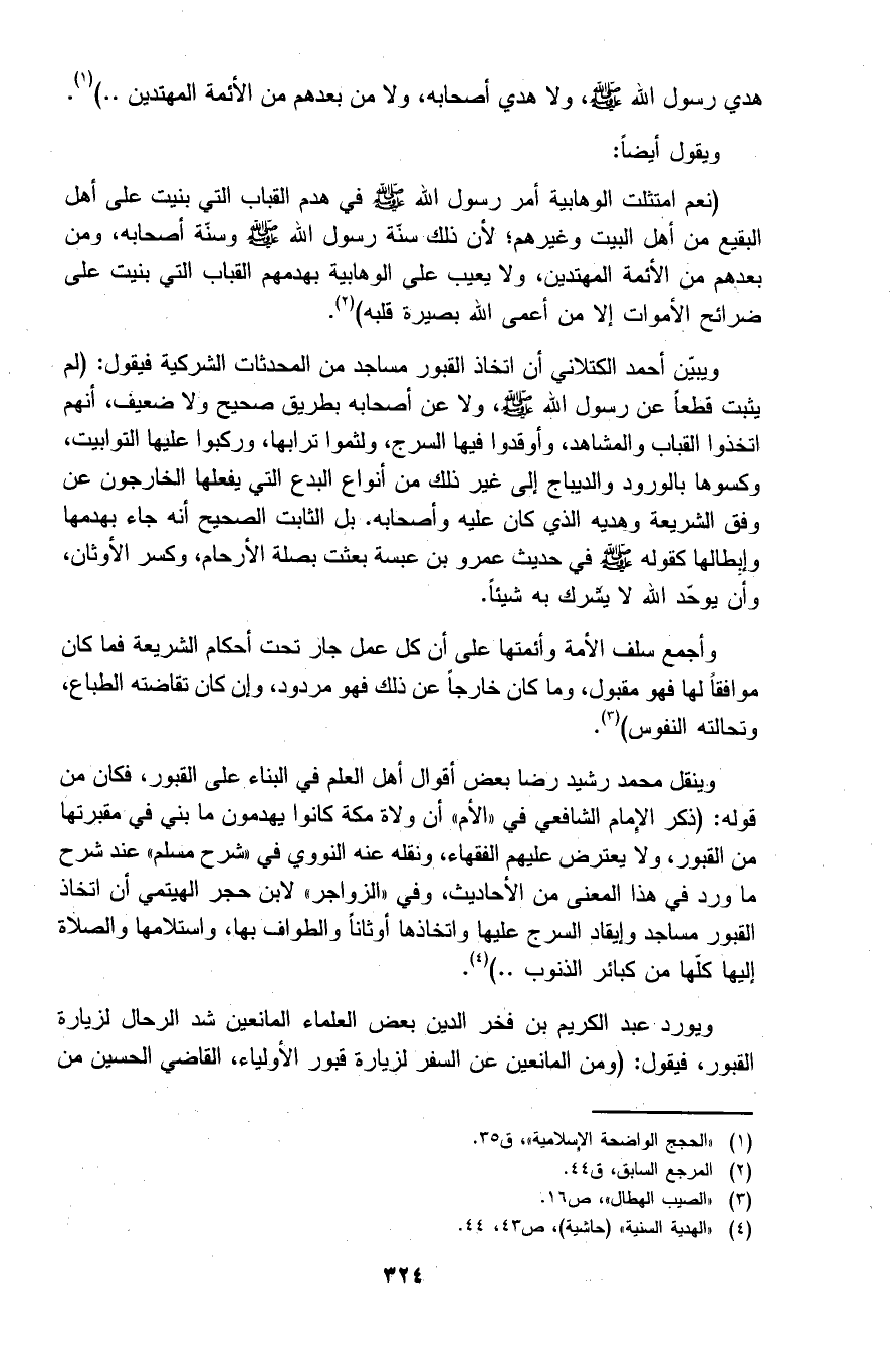 وينقل محمد رشيد رضا بعض أقوال أهل العلم في البناء على القبور، فكان من قوله: (ذكر الإمام الشافعي في "الأم" أن ولاة مكة كانوا يهدمون ما بني في مقبرتها من القبور، ولا يعترض عليهم الفقهاء، ونقله عنه النووي في "شرح مسلم" عند شرح ما ورد في هذا المعنى من الأحاديث، وفي "الزواجر" لابن حجر الهيتمي أن اتخاذ القبور مساجد وإيقاد السرج عليها واتخاذها أوثانا والطواف بها، واستلامها والصلاة إليها كلها من كبائر الذنوب..) 5.