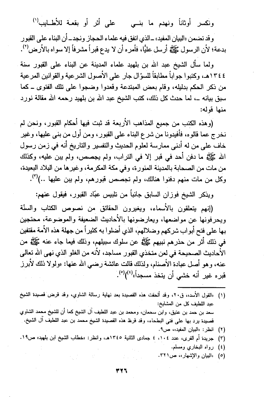 وقد تضمن "البيان المفيد" الذي اتفق فيه علماء الحجاز ونجد أن البناء على القبور بدعة؛ لأن الرسول صلى الله عليه وسلم أرسل عليا، فأمره أن لا يدع قبراً مشرفا إلا سواه بالأرض2.