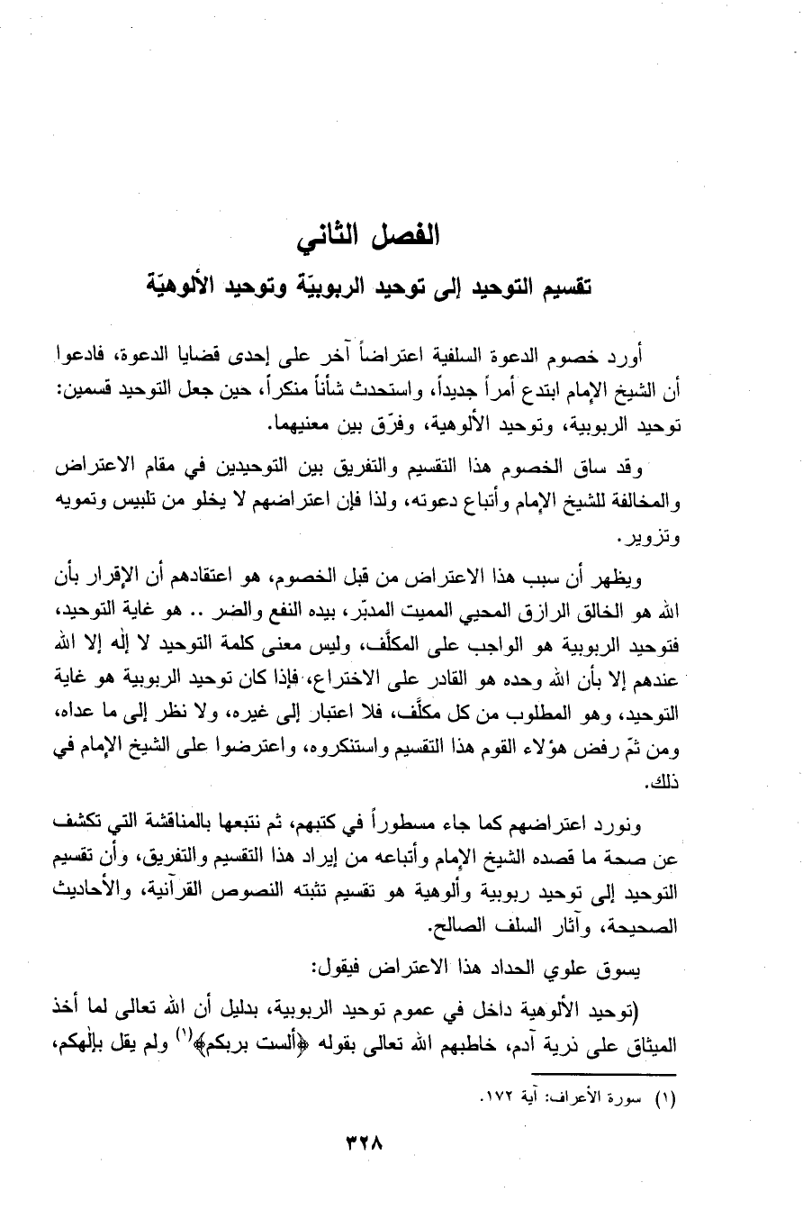 ونورد اعتراضهم كما جاء مسطورا في كتبهم، ثم نتبعها بالمناقشة التي تكشف عن صحة ما قصده الشيخ الإمام وأتباعه من إيراد هذا التقسيم والتفريق، وأن تقسيم التوحيد إلى توحيد ربوبية وألوهية هو تقسيم تثبته النصوص القرآنية، والأحاديث الصحيحة، وآثار السلف الصالح.