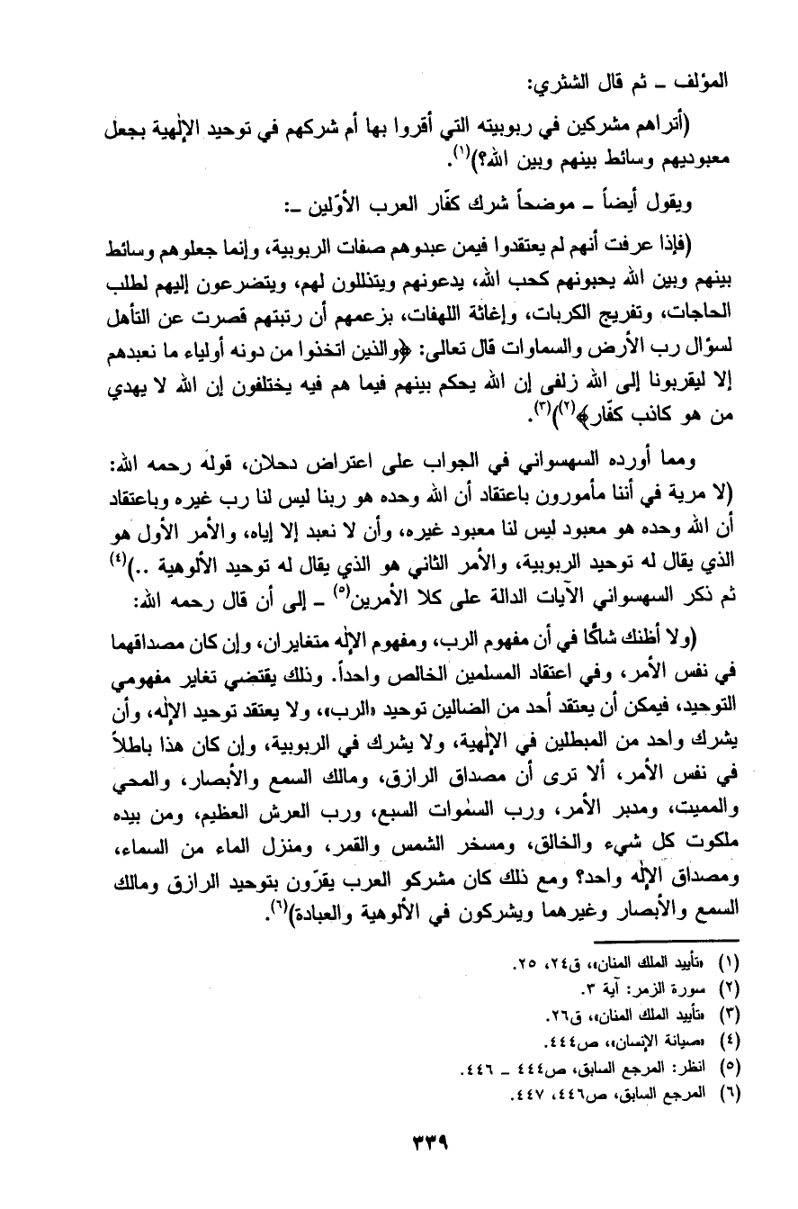 (أتراهم مشركين في ربوبيته التي أقروا بها أم شركهم في توحيد الألهية بجعل معبوديهم وسائط بينهم وبين الله؟) 1. ويقول أيضا- موضحا شرك كفار العرب الأولين-: