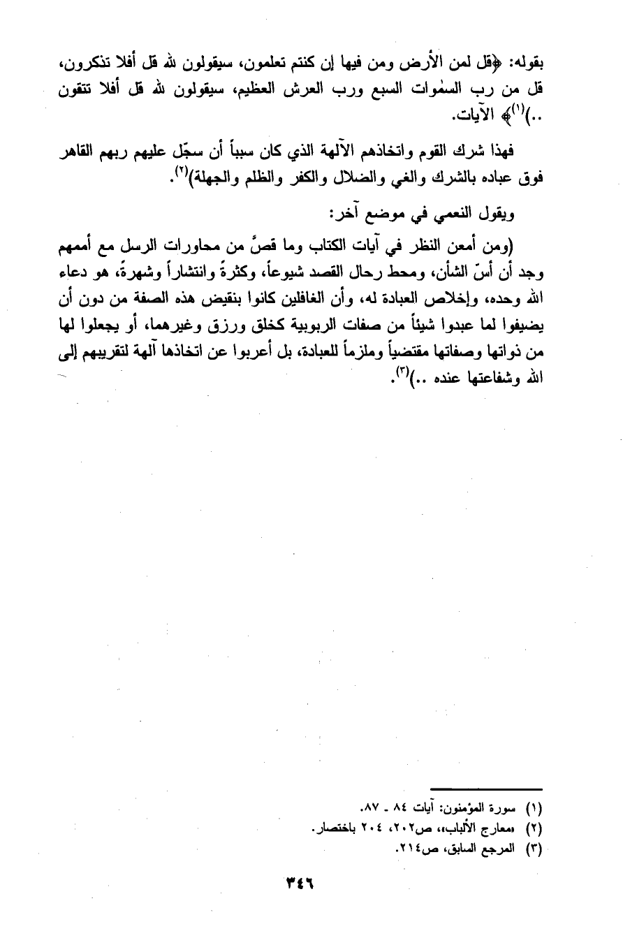 بقوله: {قُلْ لِمَنِ الأَرْضُ وَمَنْ فِيهَا إِنْ كُنْتُمْ تَعْلَمُونَ. سَيَقُولُونَ لِلَّهِ قُلْ أَفَلا تَذَكَّرُونَ. قُلْ مَنْ رَبُّ السَّمَاوَاتِ السَّبْعِ وَرَبُّ الْعَرْشِ الْعَظِيمِ. سَيَقُولُونَ لِلَّهِ قُلْ أَفَلا تَتَّقُونَ} 1 الآيات.