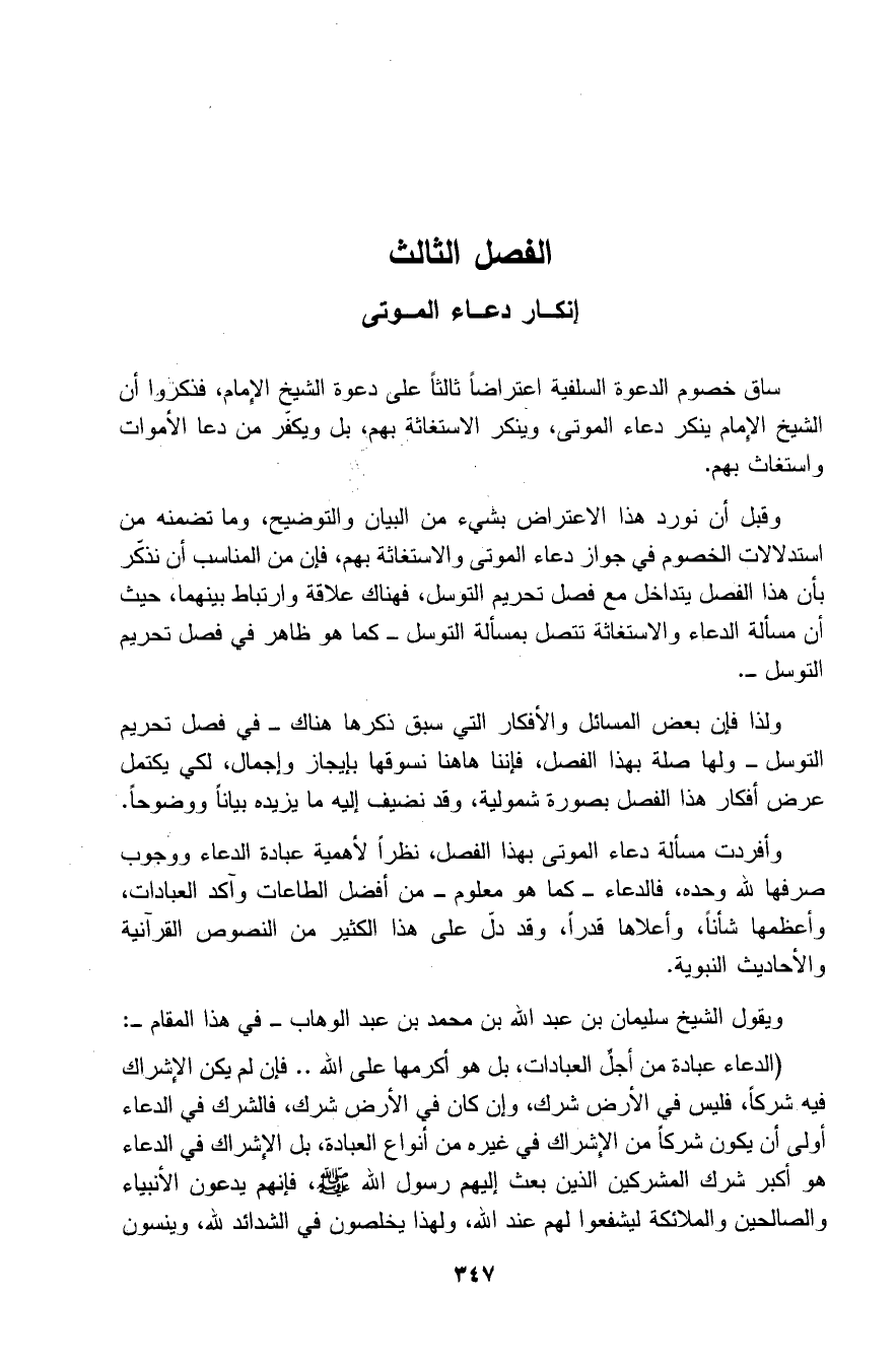 ساق خصوم الدعوة السلفية اعتراضا ثالثا على دعوة الشيخ الإمام، فذكروا أن الشيخ الإمام ينكر دعاء الموتى، وينكر الاستغاثة بهم، بل ويكفر من دعا الأموات واستغاث بهم.