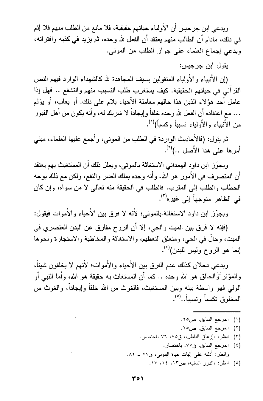 ويدعي ابن جرجيس أن الأولياء حياتهم حقيقية، فلا مانع من الطلب منهم فلا إثم في ذلك، مادام أن الطالب منهم يعتقد أن الفعل لله وحده، ثم يزيد في كذبه وافترائه، ويدعي إجماع العلماء على جواز الطلب من الموتى.