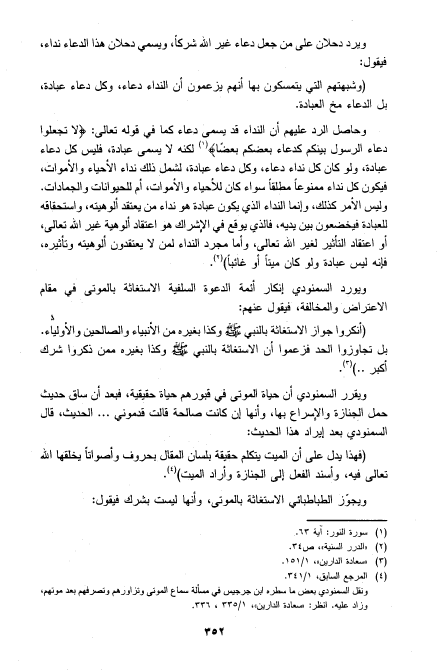 وحاصل الرد عليهم أن النداء قد يسمى دعاء كما في قوله تعالى: {لا تَجْعَلُوا دُعَاءَ الرَّسُولِ بَيْنَكُمْ كَدُعَاءِ بَعْضِكُمْ بَعْضاً} 1 لكنه لا يسمى عبادة، فليس كل دعاء عبادة، ولو كان كل نداء دعاء، وكل دعاء عبادة، لشمل ذلك نداء الأحياء والأموات، فيكون كل نداء ممنوعا مطلقا سواء كان للأحياء والأموات، أم للحيوانات والجمادات. وليس الأمر كذلك، وإنما النداء الذي يكون عبادة هو نداء من يعتقد ألوهيته، واستحقاقه للعبادة فيخضعون بين يديه، فالذي يوقع في الإشراك هو اعتقاد ألوهية غير الله تعالى، أو اعتقاد التأثير لغير الله تعالى، وأما مجرد النداء لمن لا يعتقدون ألوهيته وتأثيره، فإنه ليس عبادة ولو كان ميتا أو غائبا) 2.