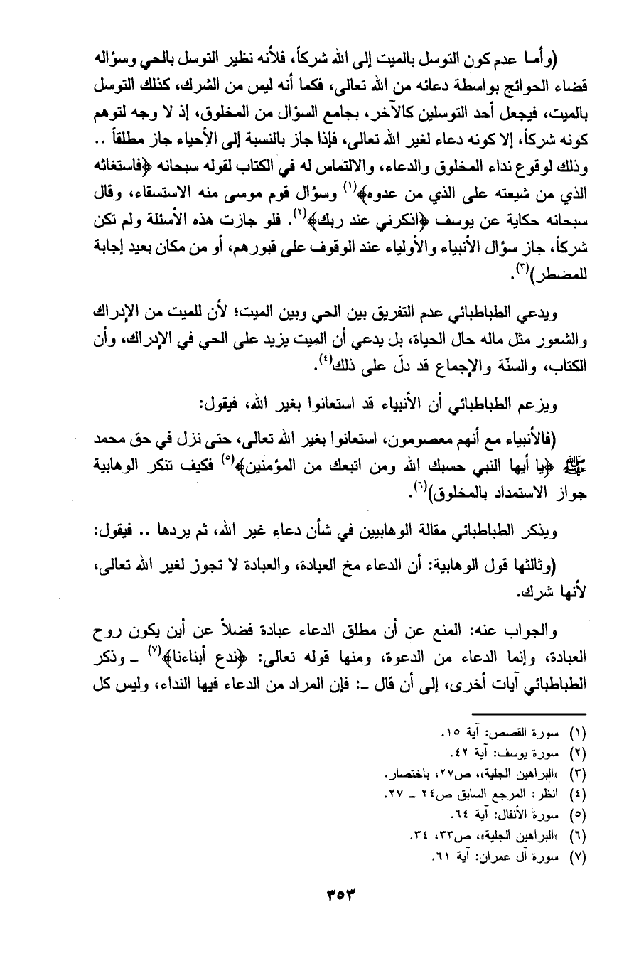 (وأما عدم كون التوسل بالميت إلى الله شركا، فلأنه نظير التوسل بالحي وسؤاله قضاء الحوائج بواسطة دعائه من الله تعالى، فكما أنه ليس من الشرك، كذلك التوسل بالميت، فيجعل أحد التوسلين كالآخر، بجامع السؤال من المخلوق، إذ لا وجه لتوهم كونه شركا، إلا كونه دعاء لغير الله تعالى، فإذا جاز بالنسبة إلى الأحياء جاز مطلقا.. وذلك لوقوع نداء المخلوق والدعاء، والالتماس له في الكتاب لقوله سبحانه {فَاسْتَغَاثَهُ الَّذِي مِنْ شِيعَتِهِ عَلَى الَّذِي مِنْ عَدُوِّهِ} 1 وسؤال قوم موسى منه الاستسقاء، وقال سبحانه حكاية عن يوسف {اذْكُرْنِي عِنْدَ رَبِّكَ} 2 فلو جازت هذه الأسئلة ولم تكن شركا، جاز سؤال الأنبياء والأولياء عند الوقوف على قبورهم، أو من مكان بعيد إجابة للمضطر) 3.