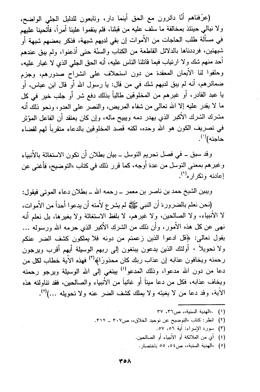 (عرفناهم أنا دائرون مع الحق أينما دار، وتابعون للدليل الجلي الواضح، ولا نبالي حينئذ بمخالفة ما سلف عليه من قبلنا، فلم ينقموا علينا أمرا، فألحينا عليهم في مسألة طلب الحاجات من الأموات إن بقي لديهم شبهة، فذكر بعضهم شبهة أو شبهتين، فرددناها بالدلائل القاطعة من الكتاب والسنة حتى أذعنوا، ولم يبق عندهم أحد منهم شك ولا ارتياب فيما قاتلنا الناس عليه، أنه الحق الجلي الذي لا غبار عليه، وحلفوا لنا الأيمان المعقدة من دون استحلاف على انشراح صدورهم، وجزم ضمائرهم، أنه لم يبق لديهم شك في من قال: يا رسول الله أو قال ابن عباس، أو يا عبد القادر، أو غيرهم من المخلوقين طالبا بذلك دفع شر أو جلب خير في كل ما لا يقدر عليه إلا الله تعالى من شفاء المريض، والنصر على العدو، ونحو ذلك أنه مشرك الشرك الأكبر الذي يهدر دمه ويبيح ماله، وإن كان يعتقد أن الفاعل المؤثر في تصريف الكون هو الله وحده، لكنه قصد المخلوقين بالدعاء متقربا لهم لقضاء حاجته) 1.