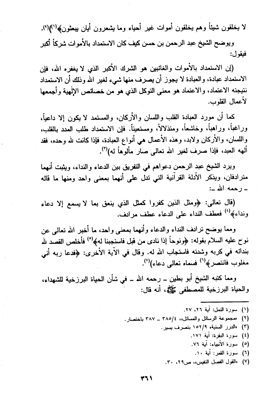 لا يَخْلُقُونَ شَيْئاً وَهُمْ يُخْلَقُونَ. أَمْوَاتٌ غَيْرُ أَحْيَاءٍ وَمَا يَشْعُرُونَ أَيَّانَ يُبْعَثُونَ} 1 2 ويوضح الشيخ عبد الرحمن بن حسن كيف كان الاستمداد بالأموات شركا أكبر فيقول: