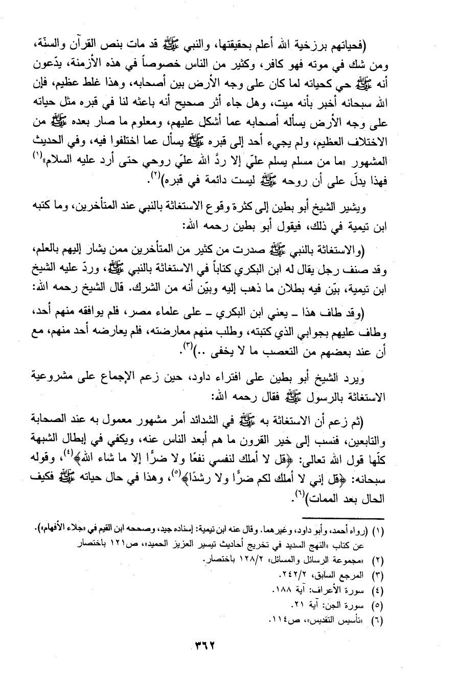 (ثم زعم أن الاستغاثة به صلى الله عليه وسلم في الشدائد أمر مشهور معمول به عند الصحابة والتابعين، فنسب إلى خير القرون ما هم أبعد الناس عنه، ويكفي في إبطال الشبهة كلها قول الله تعالى: {قُلْ لا أَمْلِكُ لِنَفْسِي نَفْعاً وَلا ضَرّاً إِلاَّ مَا شَاءَ اللَّهُ} 5 وقوله سبحانه: {قُلْ إِنِّي لا أَمْلِكُ لَكُمْ ضَرّاً وَلا رَشَداً} 6 وهذا في حال حياته صلى الله عليه وسلم فكيف الحال بعد الممات) 7.