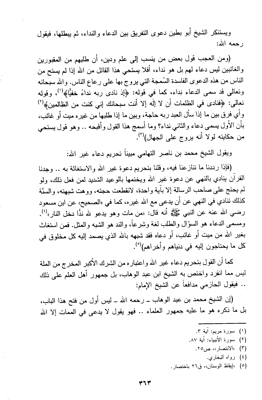 (ومن العجب قول بعض من ينسب إلى علم ودين، أن طلبهم من المقبورين والغائبين ليس دعاء لهم بل هو نداء، أفلا يستحي هذا القائل من الله إذا لم يستح من الناس من هذه الدعوى الفاسدة السمجة التي يروج بها على رعاع الناس. والله سبحانه وتعالى قد سمى الدعاء نداء، كما في قوله: {إِذْ نَادَى رَبَّهُ نِدَاءً خَفِيّاً} 1 وقوله تعالى: {فَنَادَى فِي الظُّلُمَاتِ أَنْ لا إِلَهَ إِلَّا أَنْتَ سُبْحَانَكَ إِنِّي كُنْتُ مِنَ الظَّالِمِينَ} 2 وأي فرق بين ما إذا سأل العبد ربه حاجة، وبين ما إذا طلبها من غيره ميت أو غائب، بأن الأول يسمى دعاء والثاني نداء؟ وما أسمج هذا القول وأقبحه.. وهو قول يستحي من حكايته لولا أنه يروج على الجهال) 3.