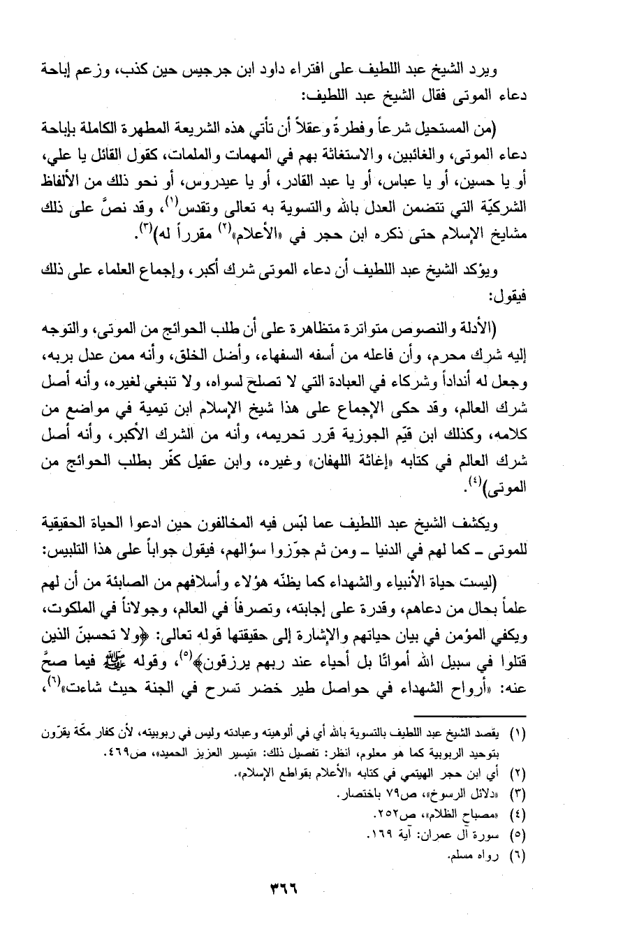 ويرد الشيخ عبد اللطيف على افتراء داود ابن جرجيس حين كذب، وزعم إباحة دعاء الموتى فقال الشيخ عبد اللطيف: