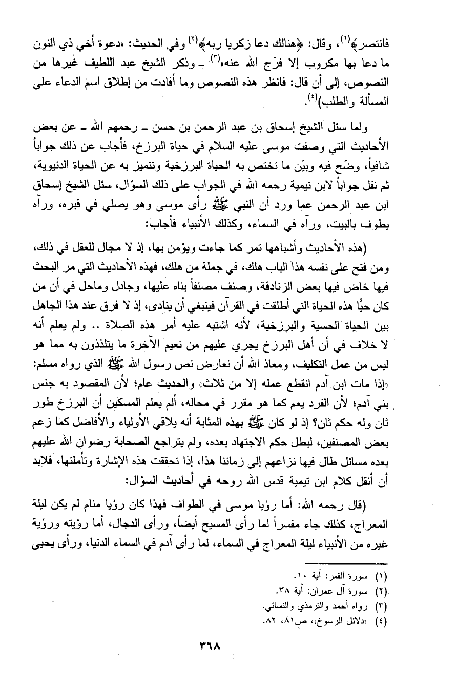 ولما سئل الشيخ إسحاق بن عبد الرحمن بن حسن- رحمهم الله- عن بعض الأحاديث التي وصفت موسى عليه السلام في حياة البرزخ، فأجاب عن ذلك جوابا شافيا، وضح فيه وبين ما تختص به الحياة البرزخية وتتميز به عن الحياة الدنيوية، ثم نقل جوابا لابن تيمية رحمه الله في الجواب على ذلك السؤال، سئل الشيخ إسحاق ابن عبد الرحمن عما ورد أن النبي صلى الله عليه وسلم رأى موسى وهو يصلي في قبره، ورآه يطوف بالبيت، ورآه في السماء، وكذلك الأنبياء فأجاب: