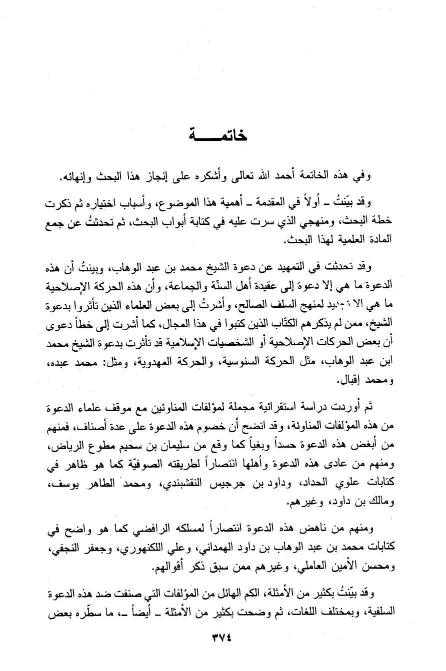 ثم أوردت دراسة استقرائية مجملة لمؤلفات المناوئين مع موقف علماء الدعوة من هذه المؤلفات المناوئة، وقد اتضح أن خصوم هذه الدعوة على عدة أصناف، فمنهم من أبغض هذه الدعوة حسدا وبغيا كما وقع من سليمان بن سحيم مطوع الرياض، ومنهم من عادى هذه الدعوة وأهلها انتصارا لطريقته الصوفية كما هو ظاهر في كتابات علوي الحداد، وداود بن جرجيس النقشبندي، ومحمد الطاهر يوسف، ومالك بن داود، وغيرهم.