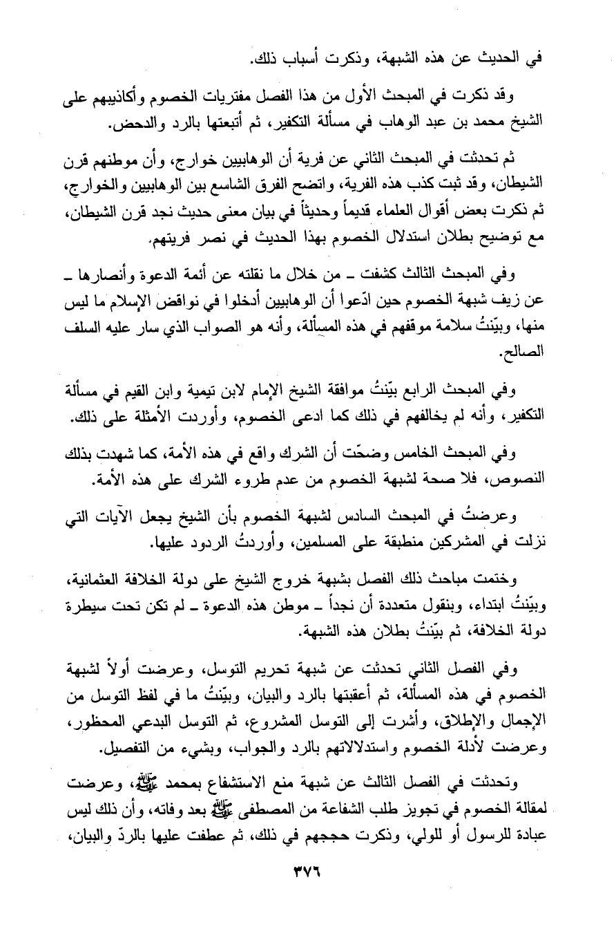 وختمت مباحث ذلك الفصل بشبهة خروج الشيخ على دولة الخلافة العثمانية، وبينت ابتداء، وبنقول متعددة أن نجدا- موطن هذه الدعوة- لم تكن تحت سيطرة دولة الخلافة، ثم بينت بطلان هذه الشبهة.