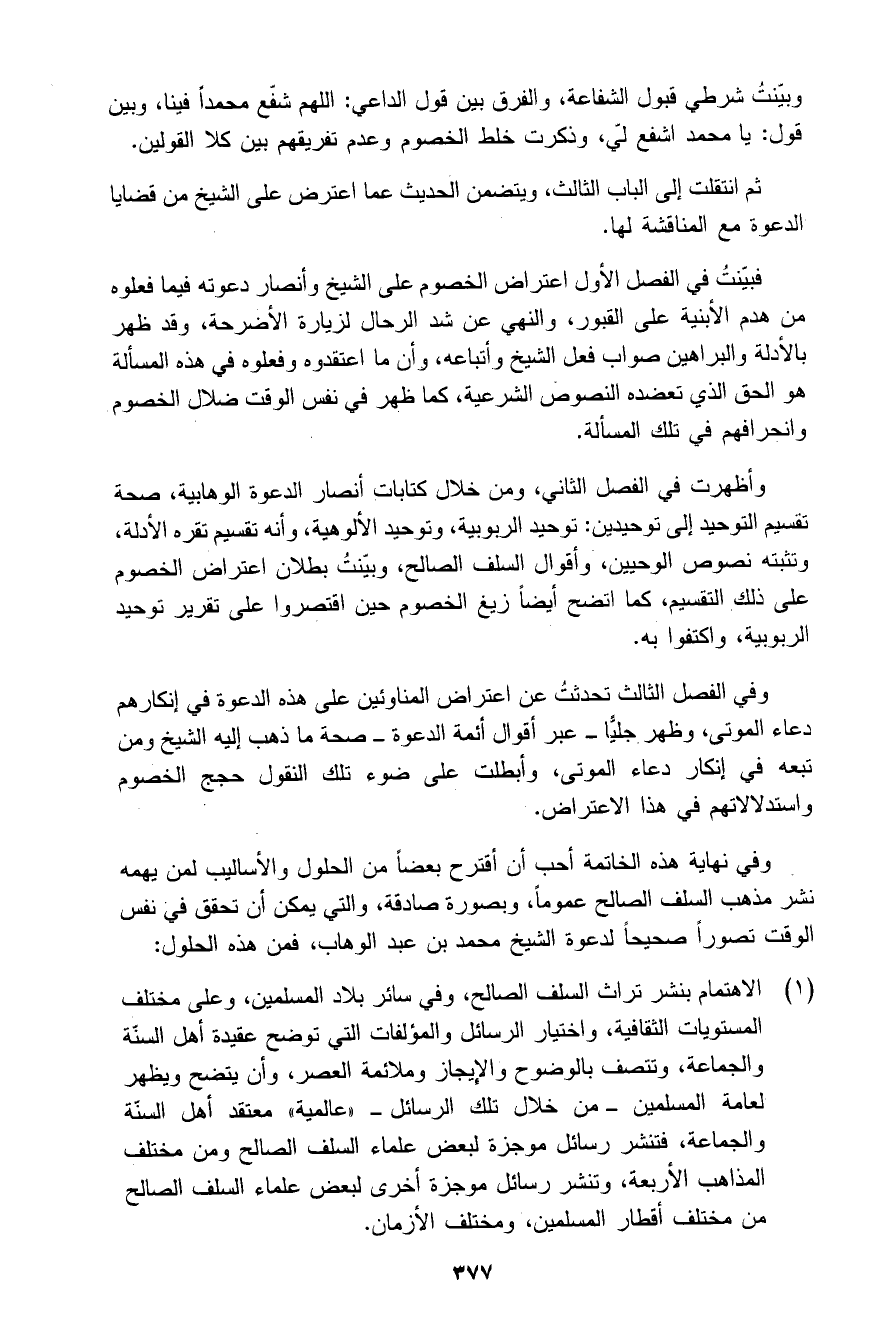 وفي الفصل الثالث تحدثت عن اعتراض المناوئين على هذه الدعوة في إنكارهم دعاء الموتى، وظهر جليا- عبر أقوال أئمة الدعوة- صحة ما ذهب إليه الشيخ ومن تبعه في إنكار دعاء الموتى، وأبطلت على ضوء تلك النقول حجج الخصوم واستدلالاتهم في هذا الاعتراض.
