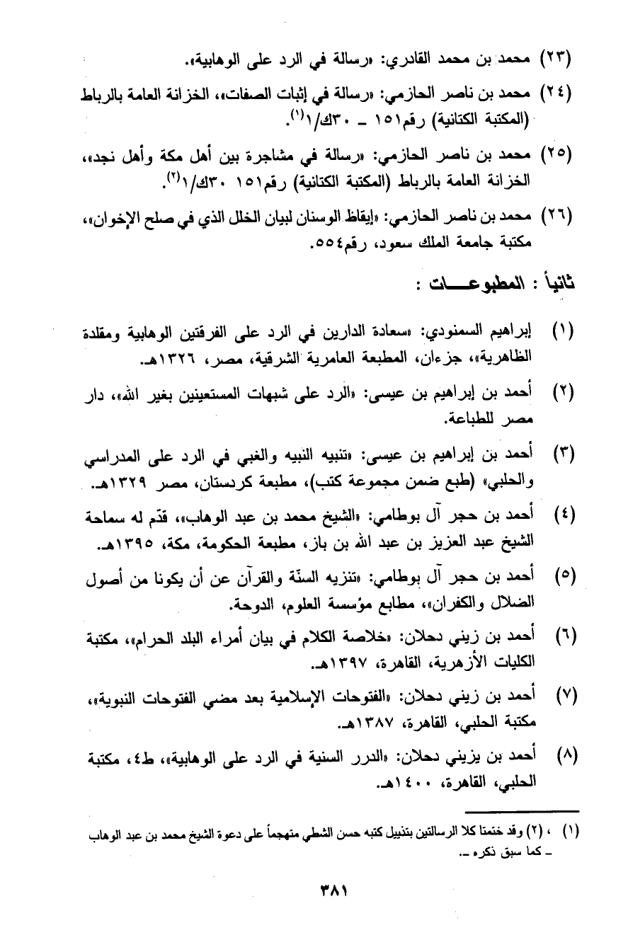 (8) أحمد بن زيني دحلان: "الدرر السنية في الرد على الوهابية"، ط 4، مكتبة الحلبي، القاهرة، 1400 هـ.