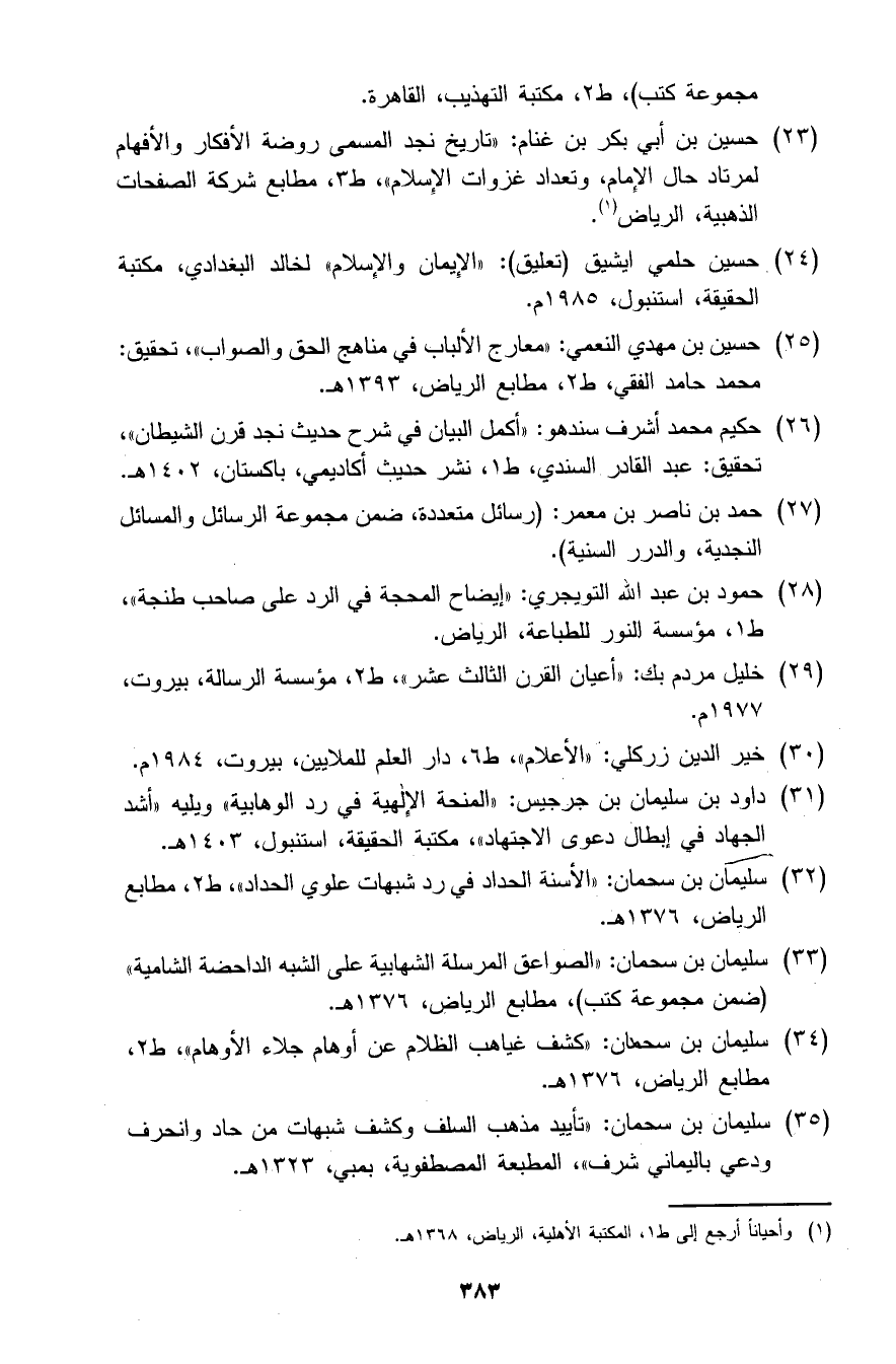 (35) سليمان بن سحمان: "تأييد مذهب السلف وكشف شبهات من حاد وانحرف ودعي باليماني شرف"، المطبعة المصطفوية، بمبي، 1323 هـ.
