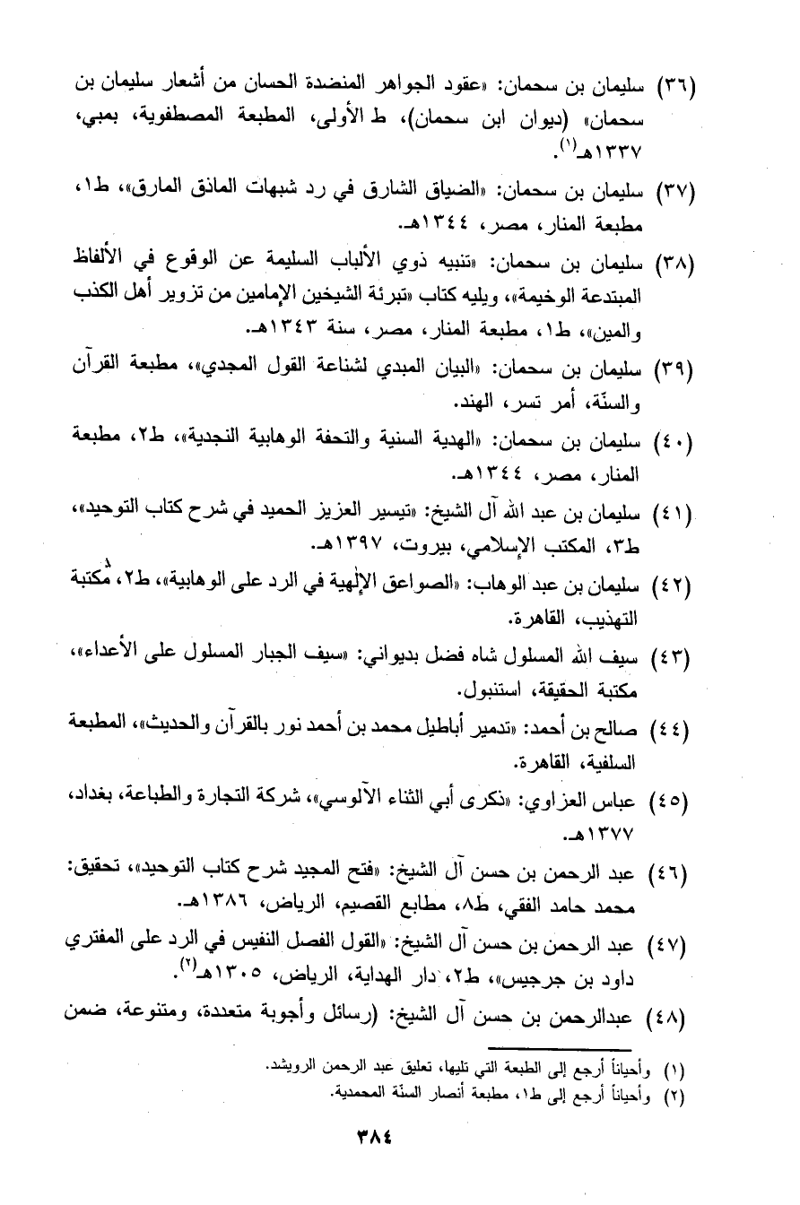 (39) سليمان بن سحمان: "البيان المبدي لشناعة القول المجدي"، مطبعة القرآن والسنّة، أمر تسر، الهند.