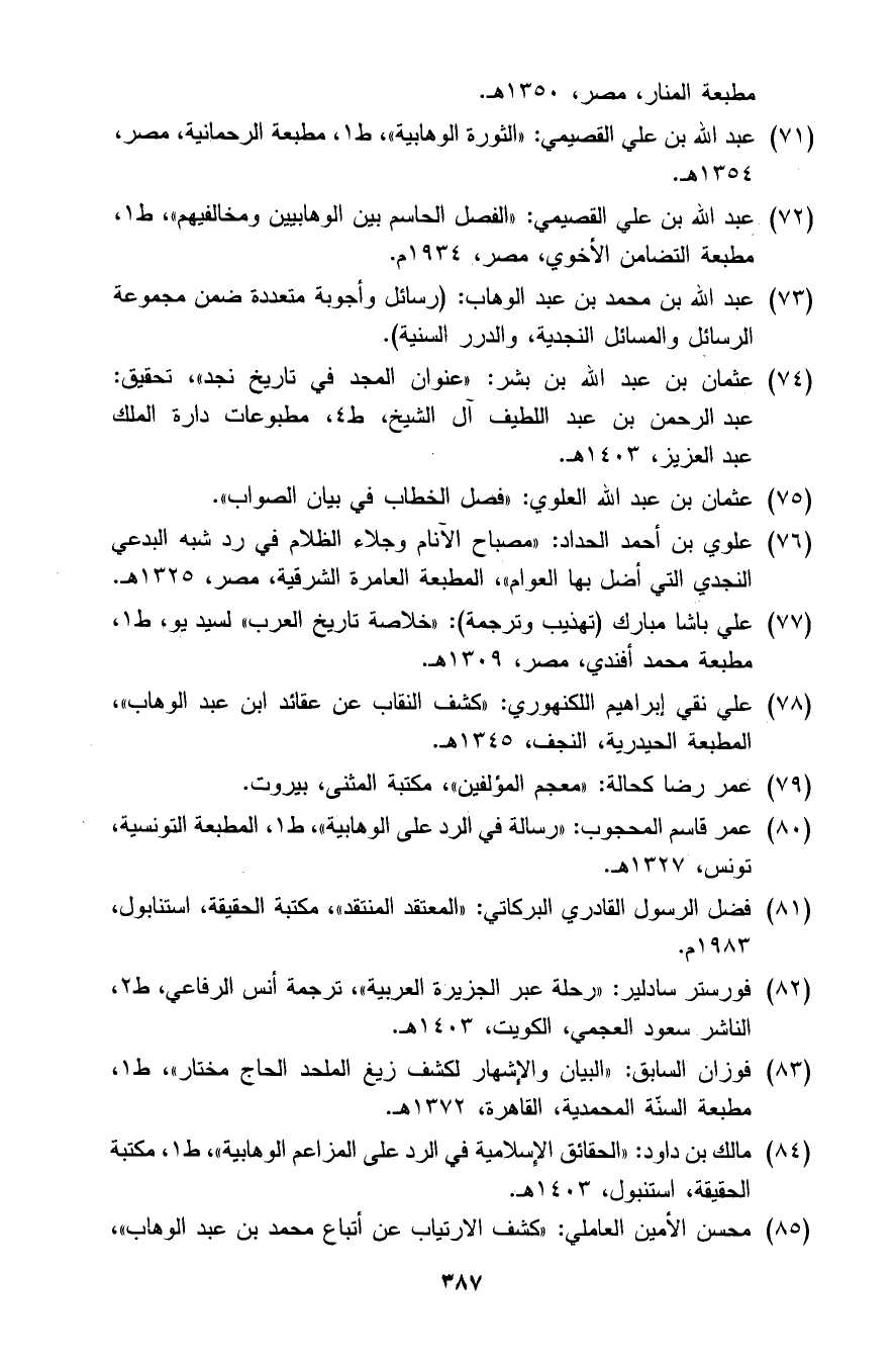 (71) عبد الله بن علي القصيمي: "الثورة الوهابية"، ط1، مطبعة الرحمانية، مصر، 1354 هـ.