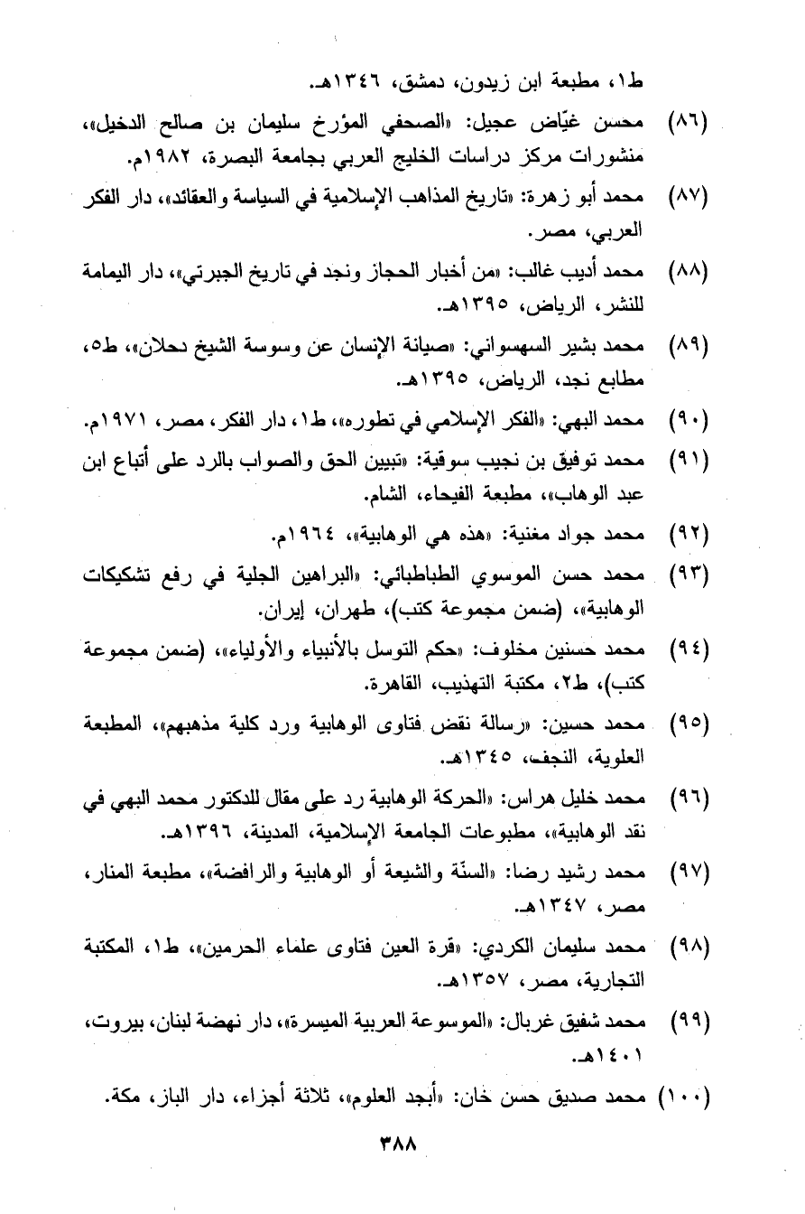 (95) محمد حسين: "رسالة نقض فتاوى الوهابية ورد كلية مذهبهم"، المطبعة العلوية، النجف، 1345 هـ.