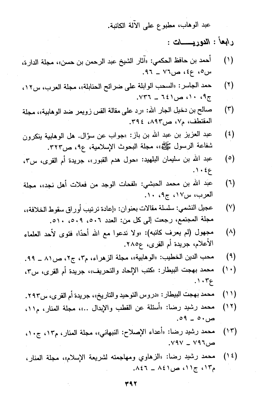 (9) محب الدين الخطيب: "الوهابية"، مجلة الزهراء، م 3، ج 2، ص 81 - 99.