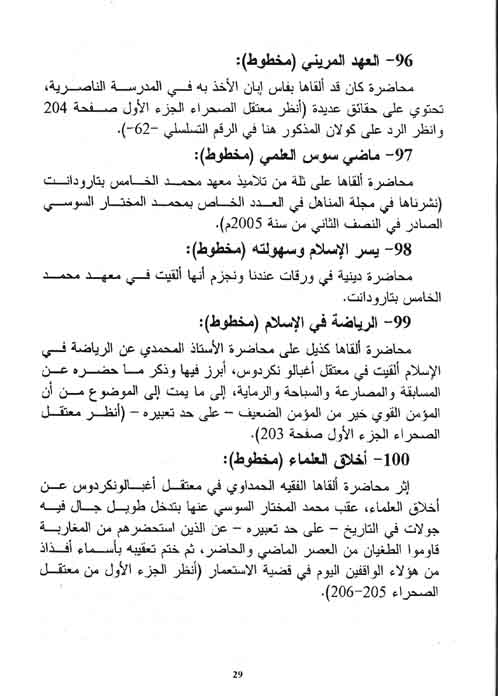 محاضرة ألقاها على ثلة من تلاميذ معهد محمد الخامس بتارودانت (نشرناها في مجلة المناهل في العدد الخاص بمحمد المختار السوسي الصادر في النصف الثاني من سنة 2005م)